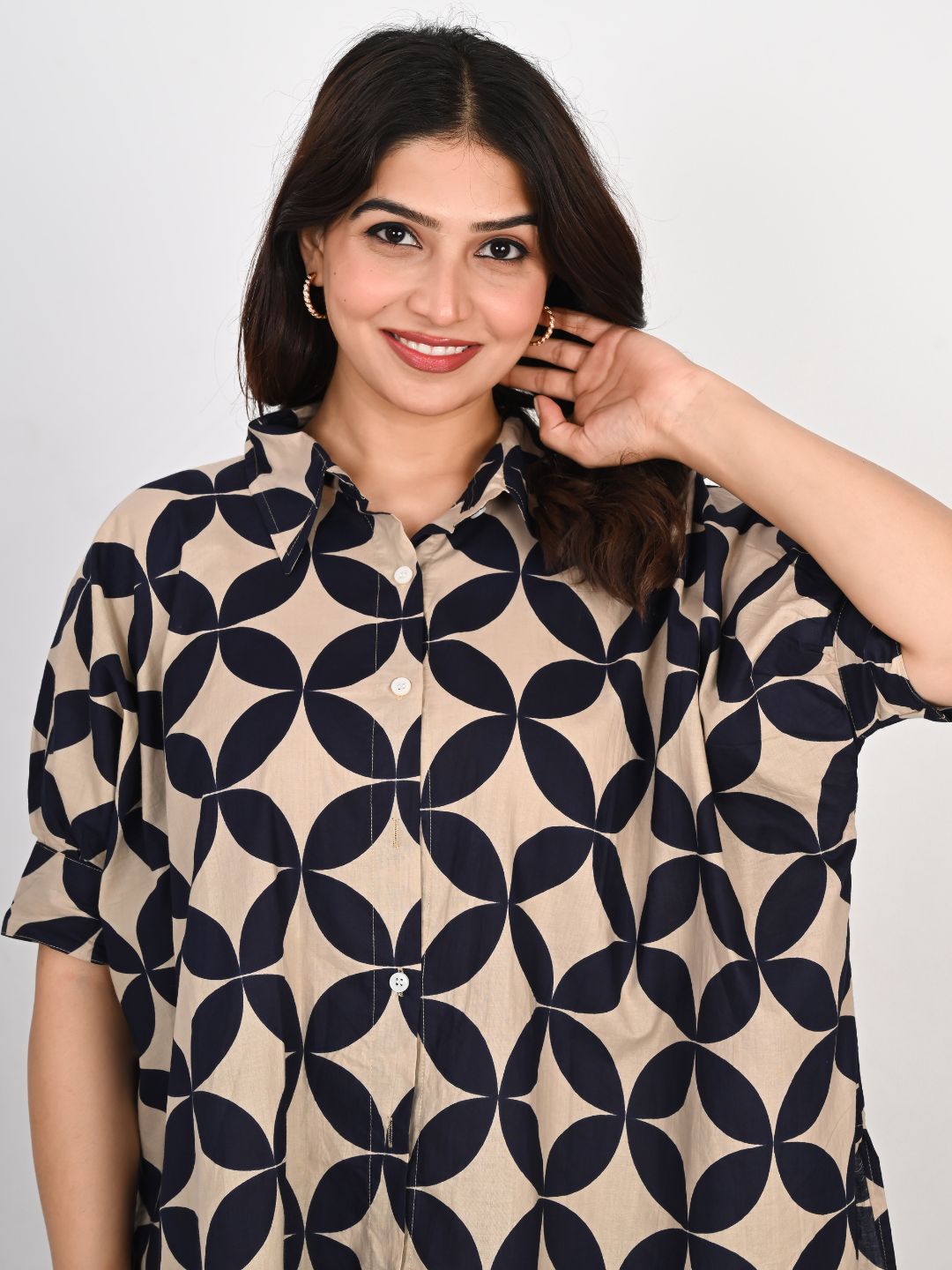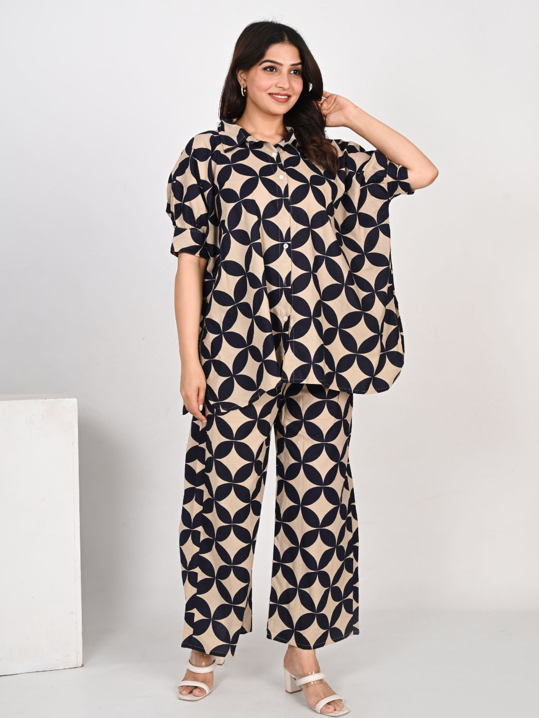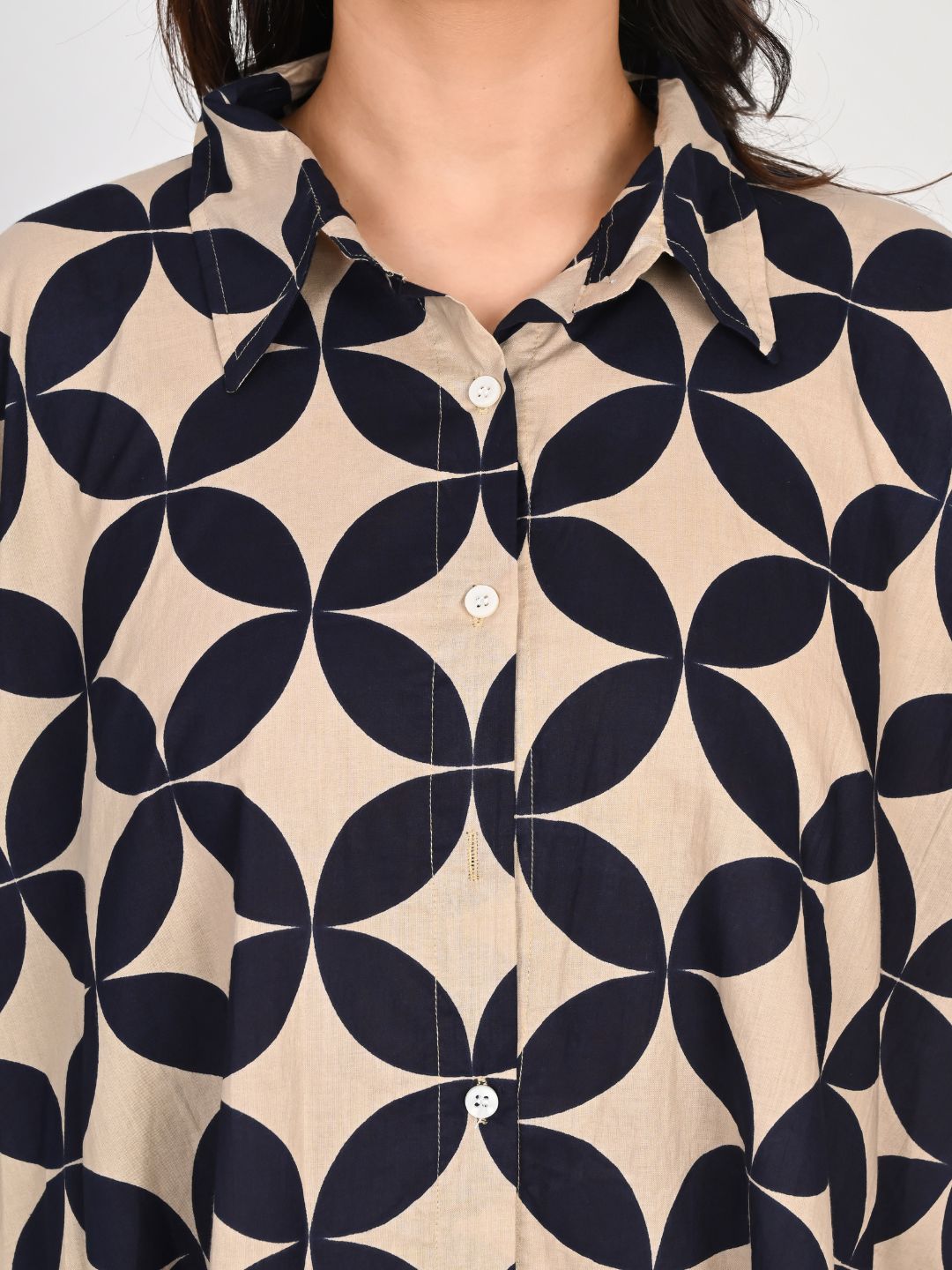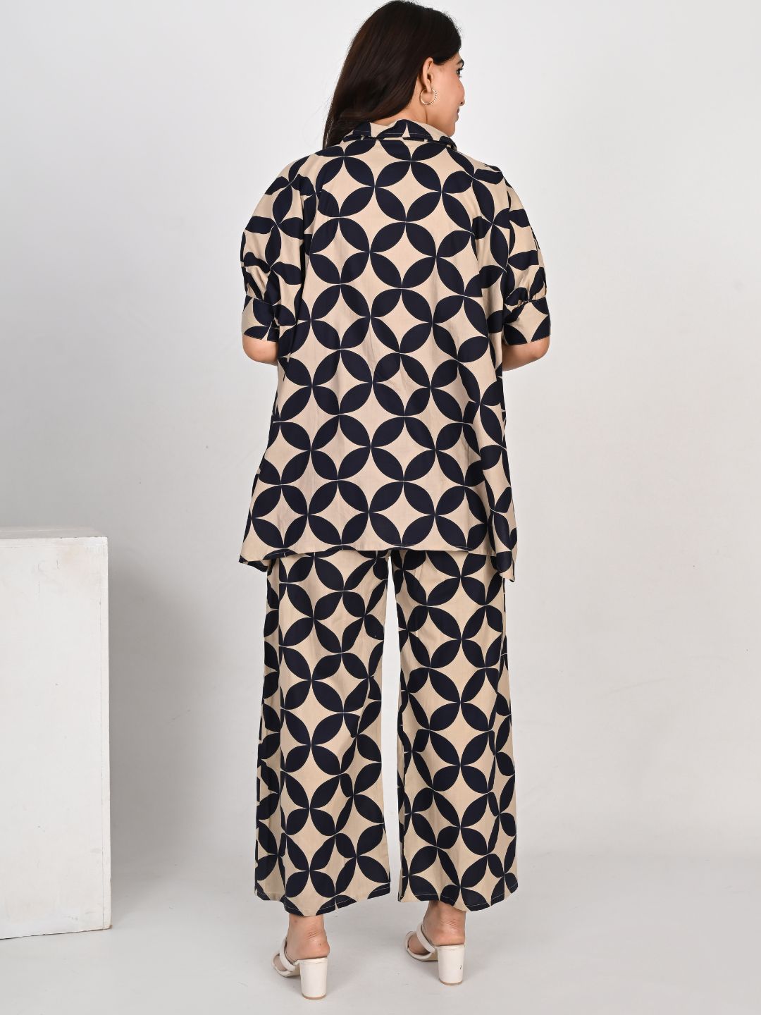 Beige Geometric Printed Shirt Collar Co-ords Set