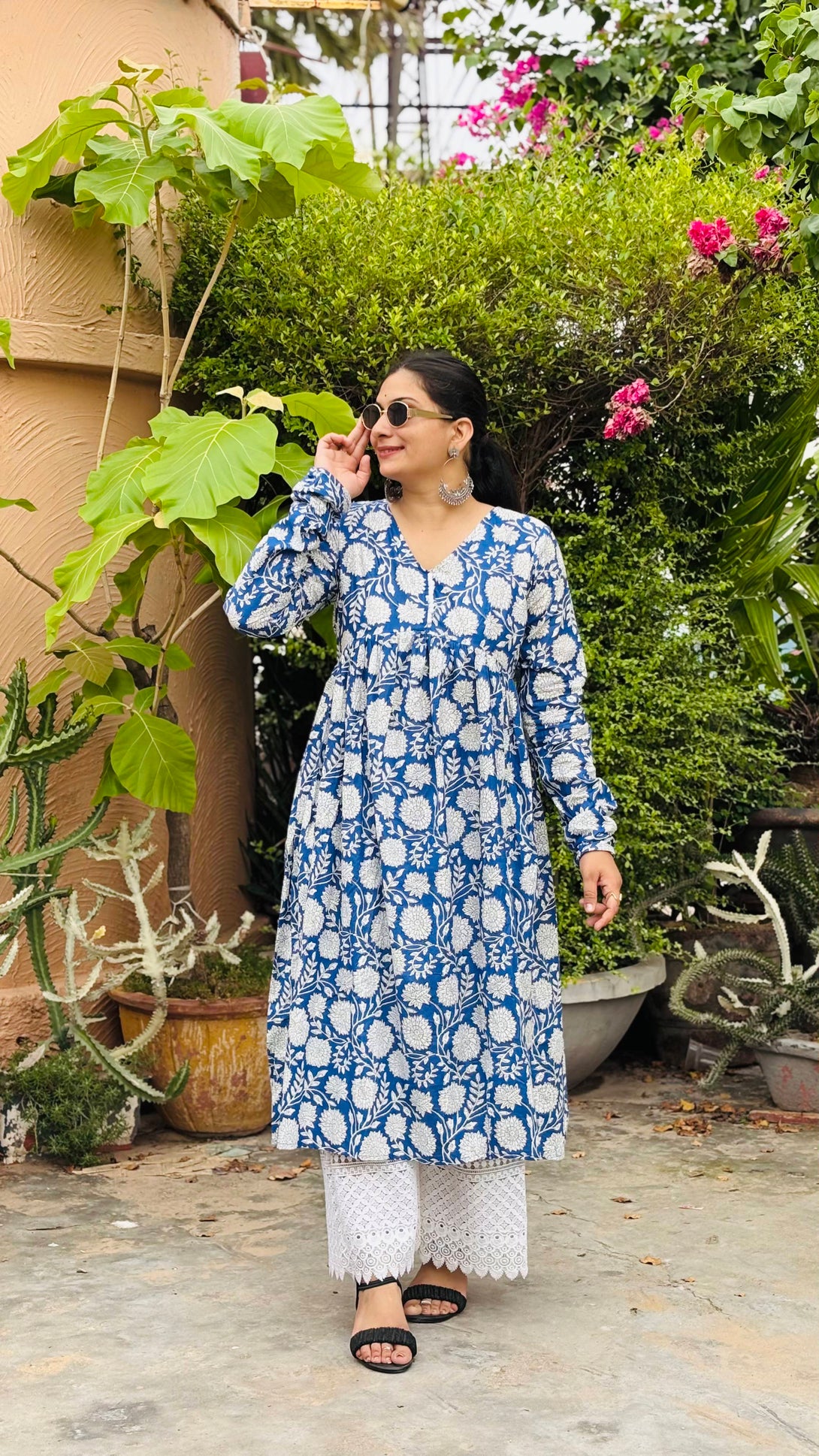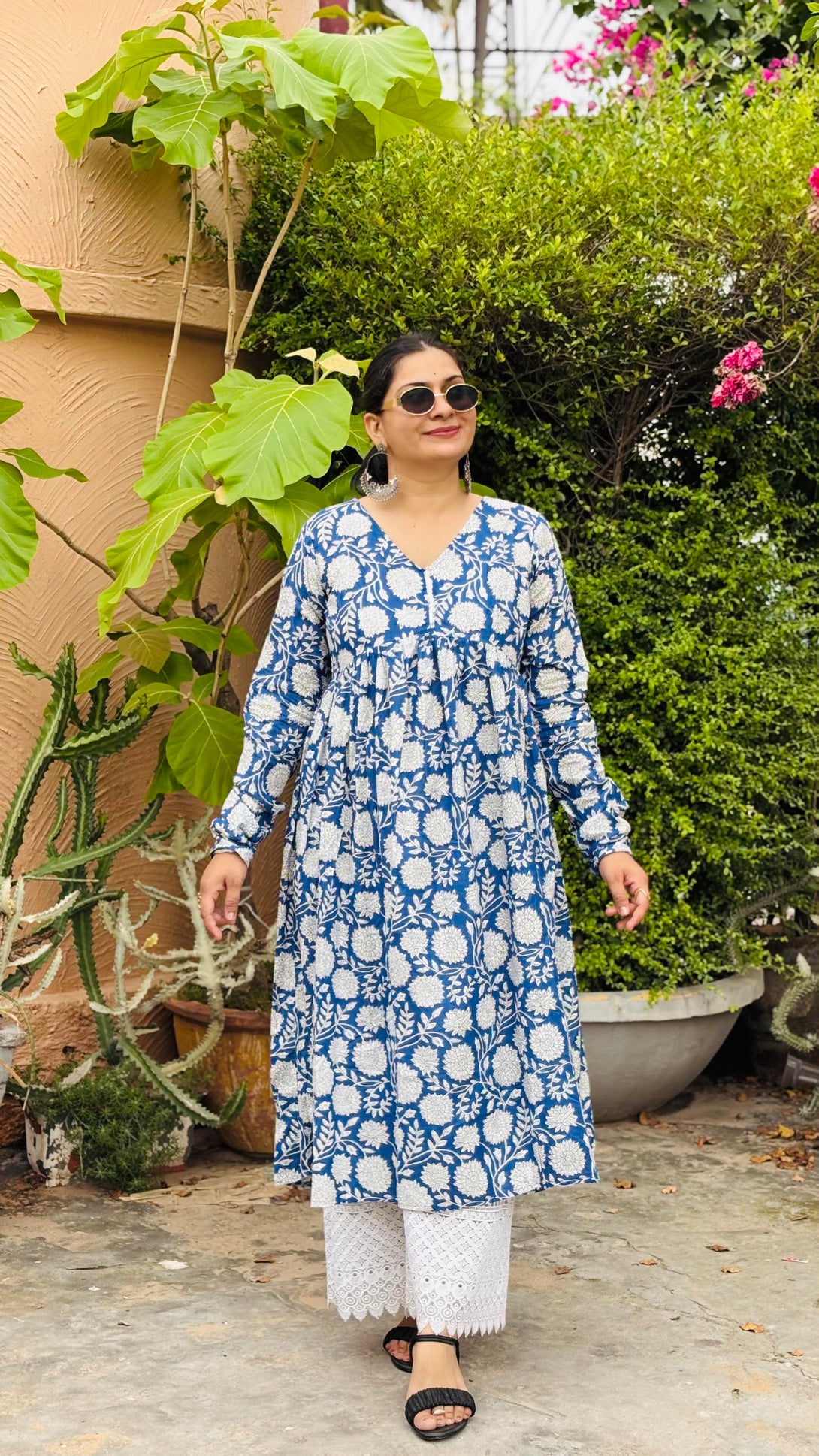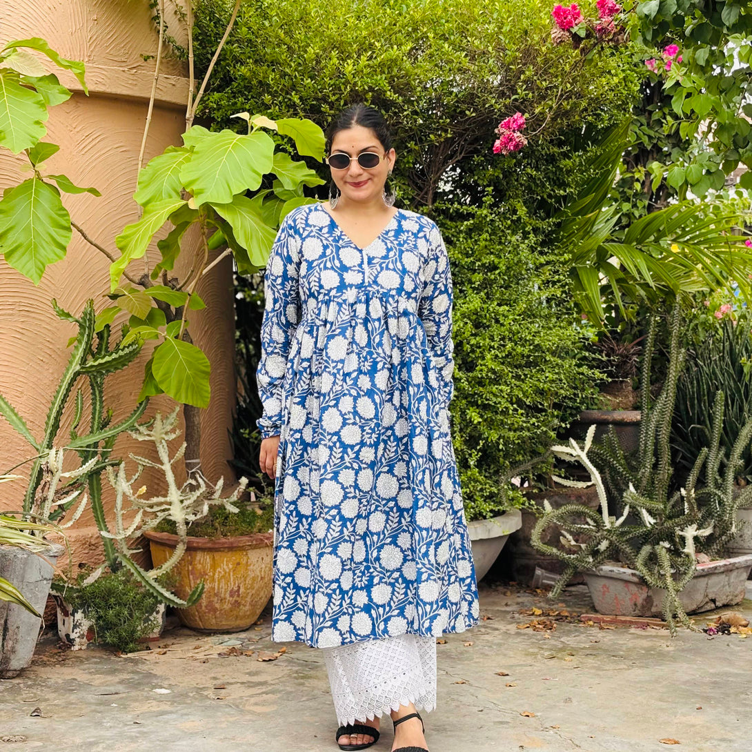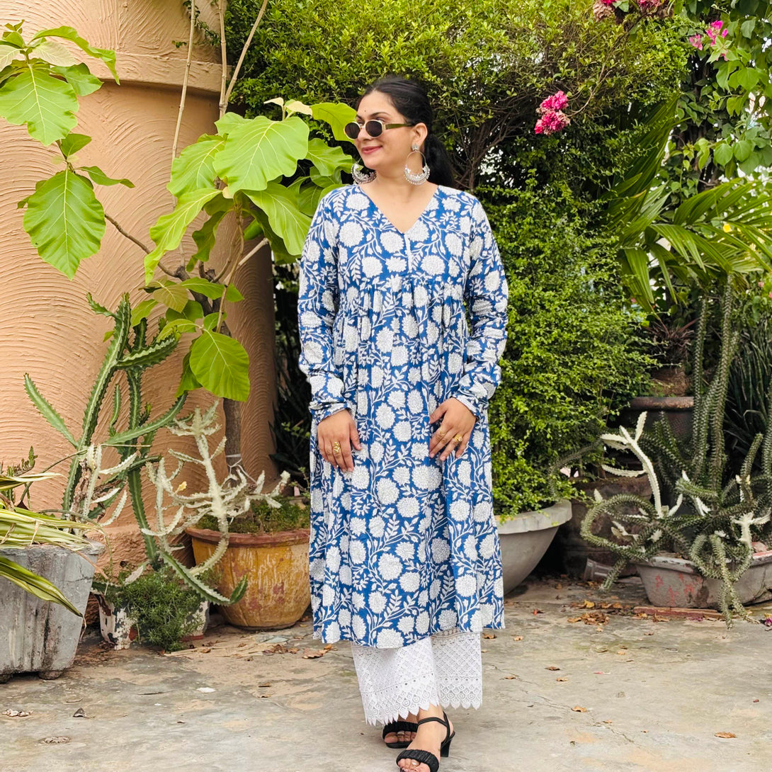 Step out in classic comfort and style with this beautiful indigo blue cotton Anarkali kurta. The kurta features a captivating white block print pattern of intricate floral motifs, creating a fresh and traditional look. Designed with a flattering V-neckline and full-length sleeves, its gathered waistline allows the fabric to flow gracefully, offering a comfortable and elegant silhouette.