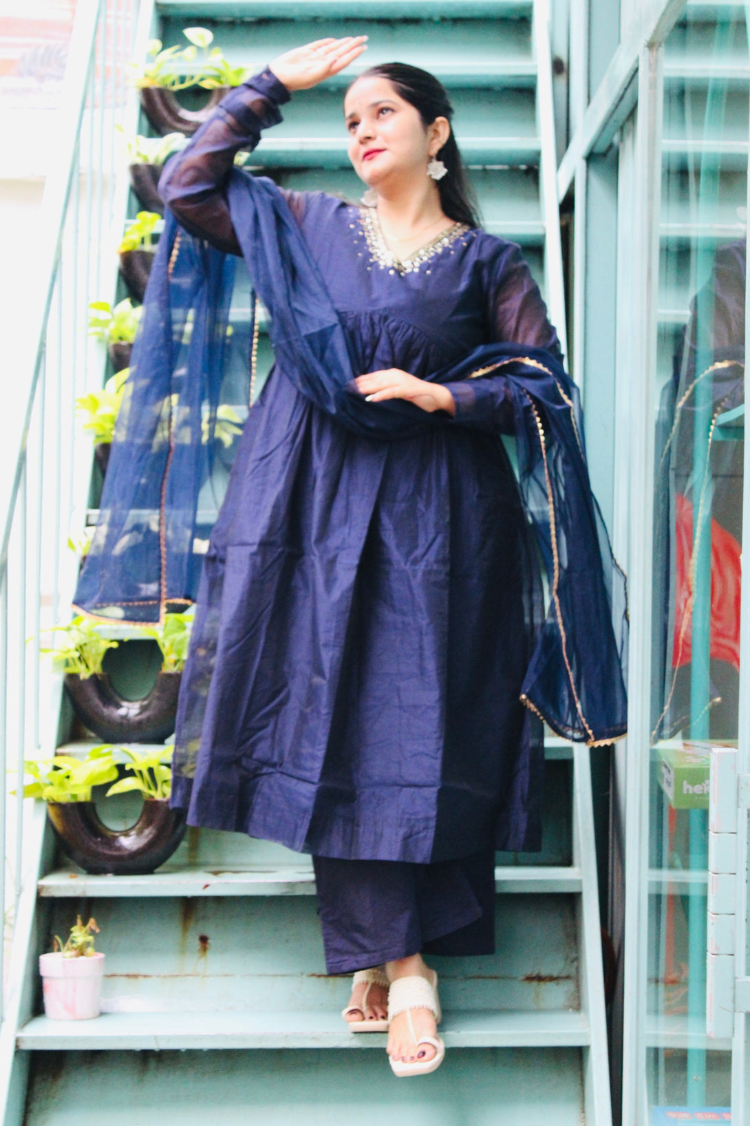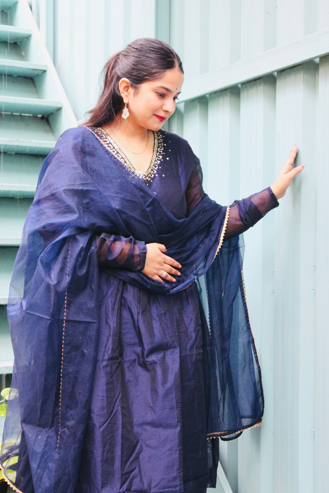 Blue Chanderi V Neck Solid Kurta Set for Women