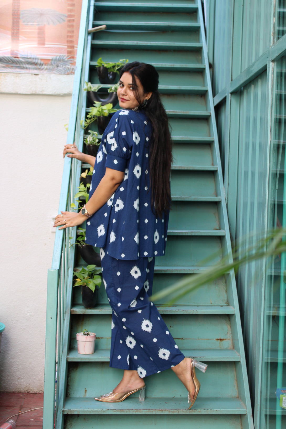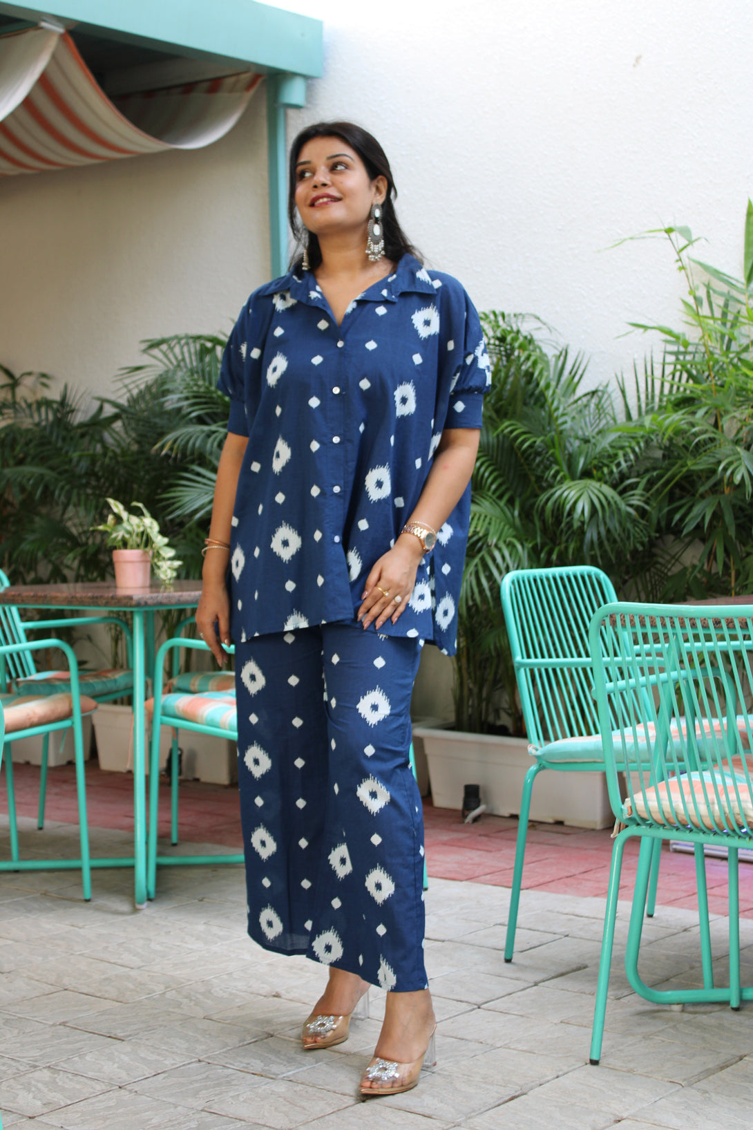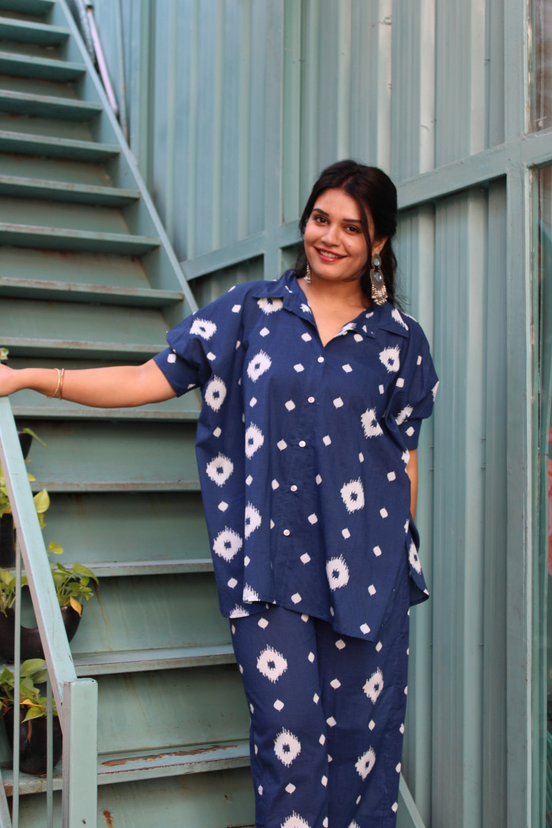 The matching wide-leg pants are crafted from a soft, breathable fabric that drapes beautifully, providing a comfortable and airy feel. Both the top and bottom are adorned with a modern Ikat-inspired print, featuring a mesmerizing pattern of white rhombus shapes on a deep blue background. This unique design adds an artistic touch to your loungewear collection, ensuring you look polished even on your most relaxed days.