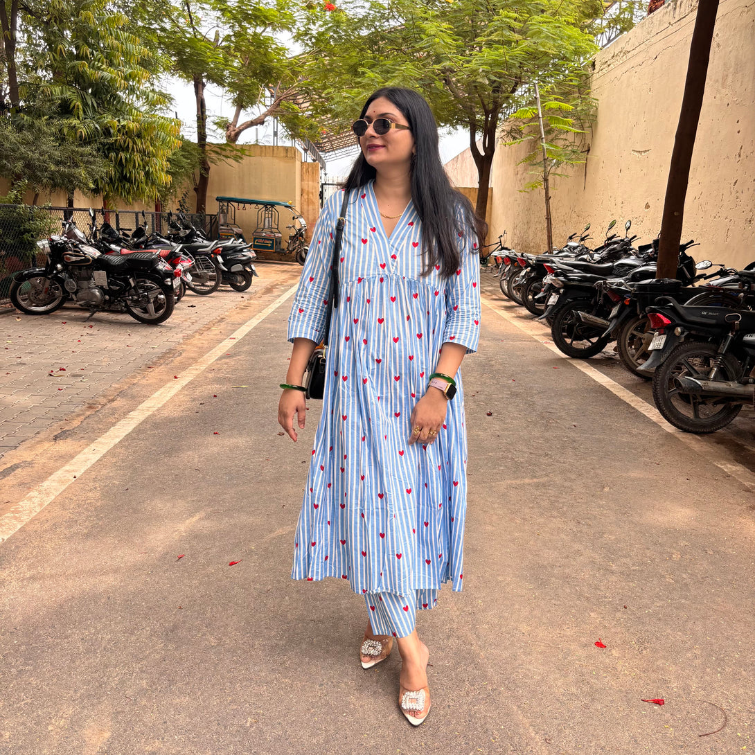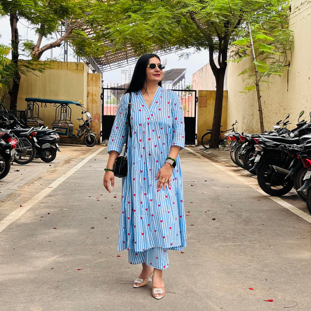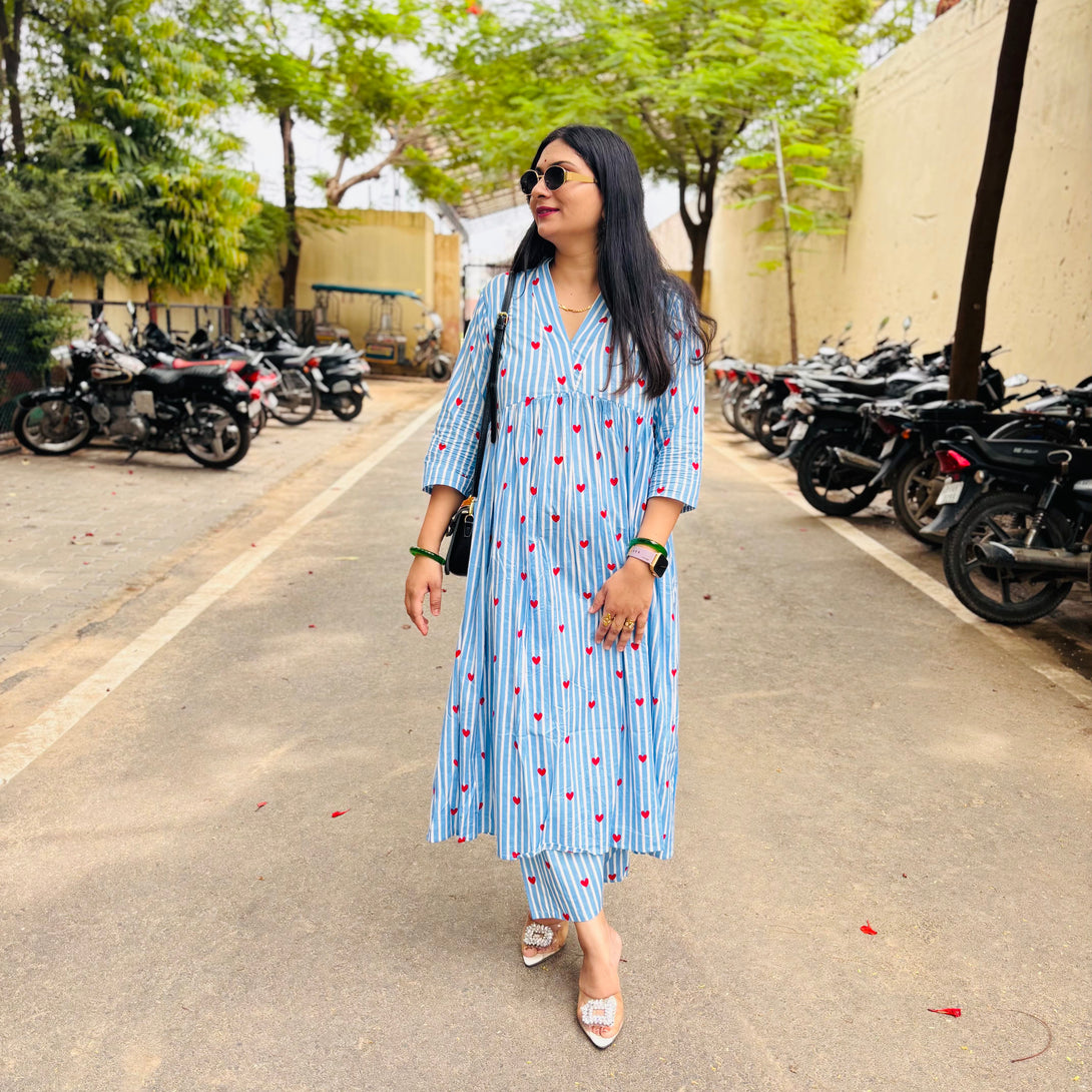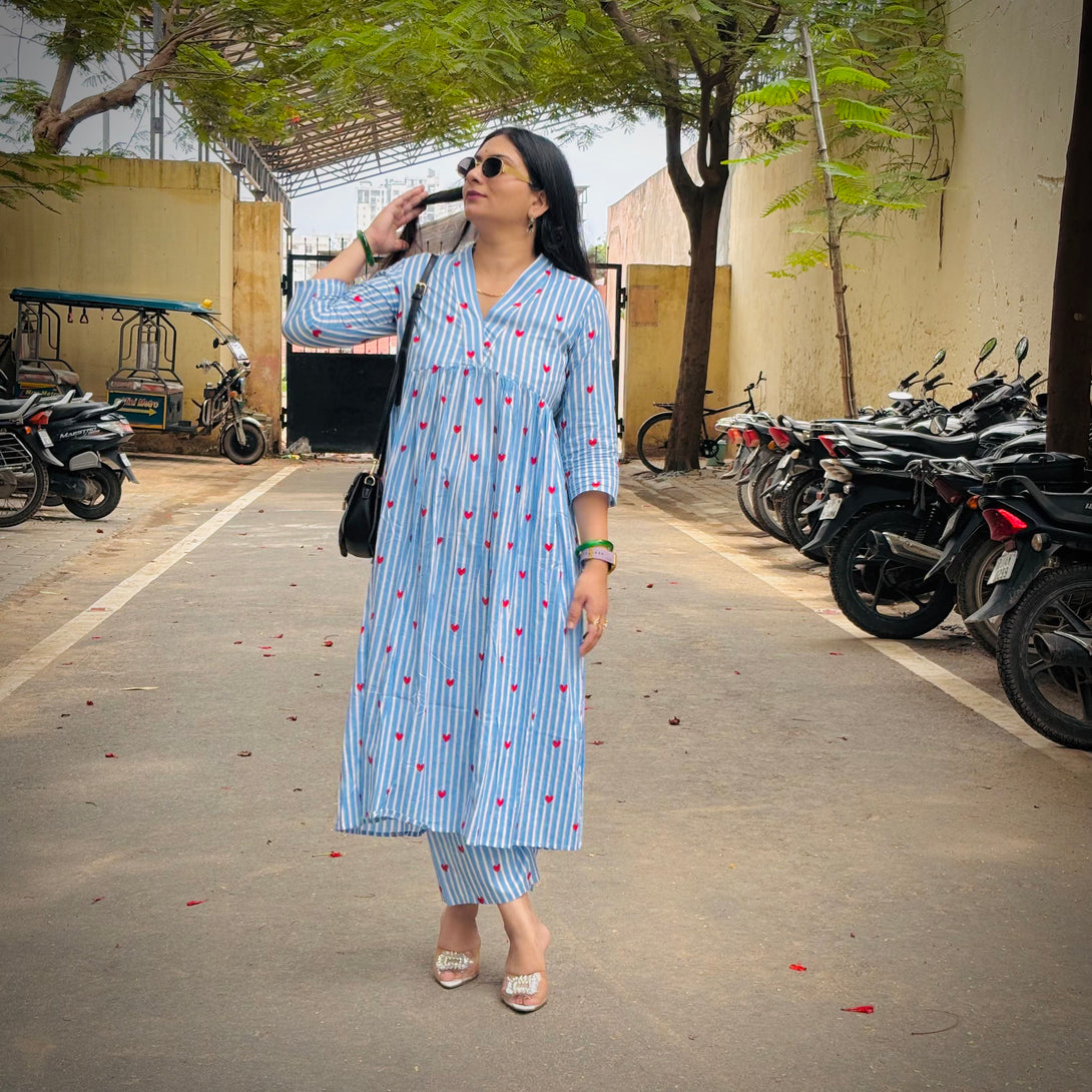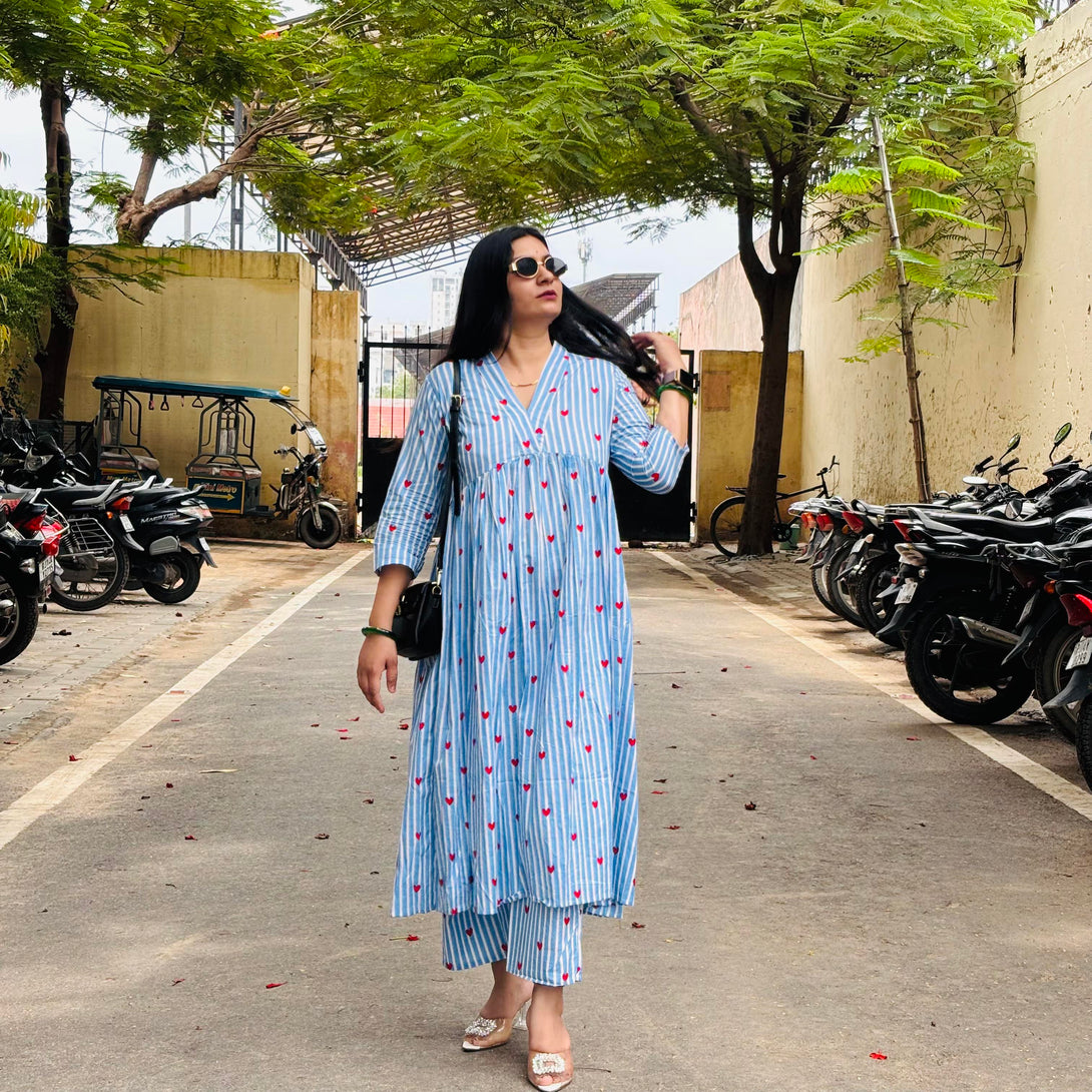 Embrace a charming and chic look with this delightful light blue and white striped kurta set. The A-line kurta features a relaxed fit and a flattering V-neckline, with an all-over pattern of small red hearts that add a playful touch. The three-quarter sleeves and flared silhouette ensure both comfort and style. The set is completed with matching striped trousers, creating a coordinated and fashionable ensemble perfect for a casual day out or a brunch with friends.