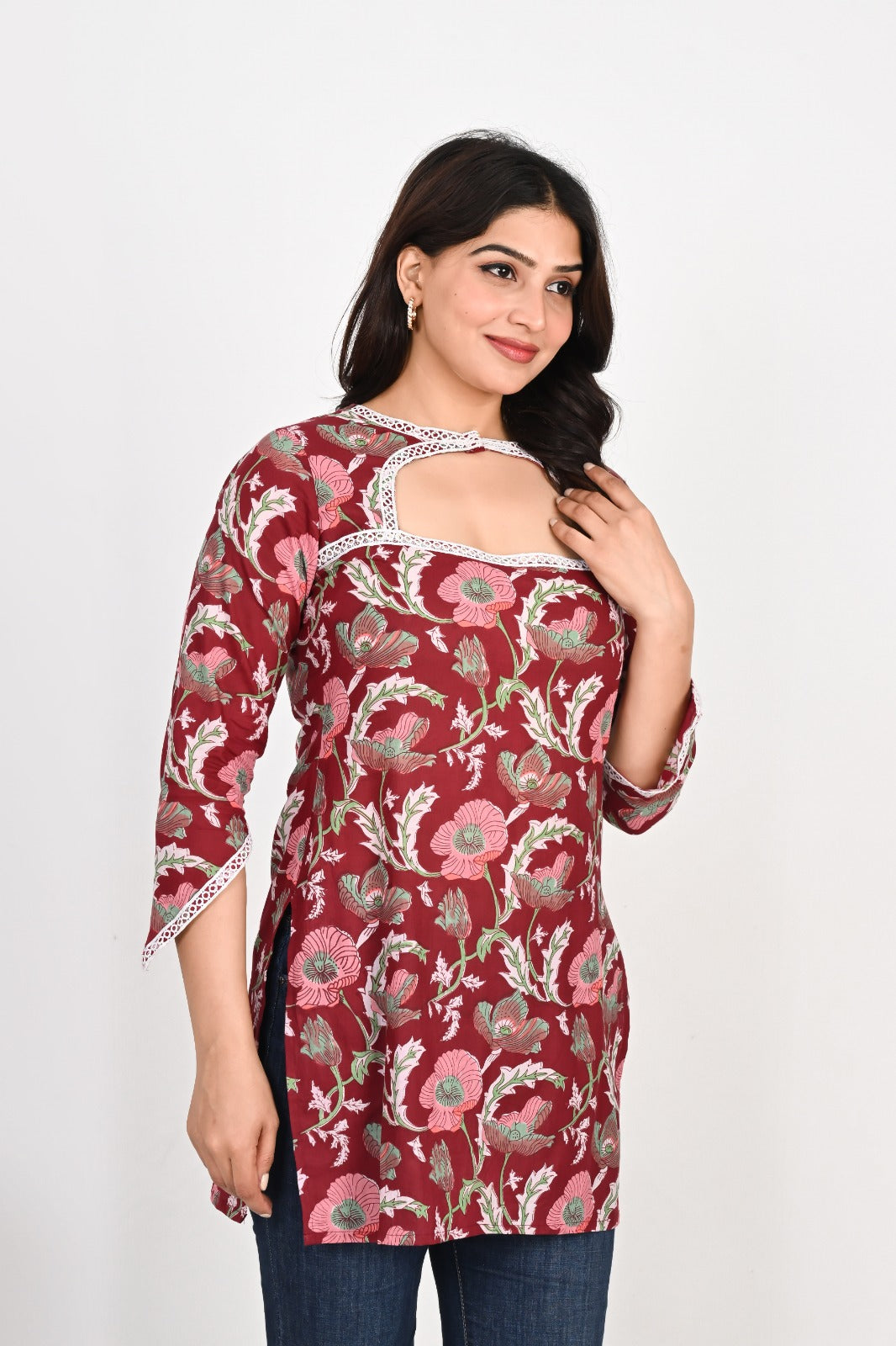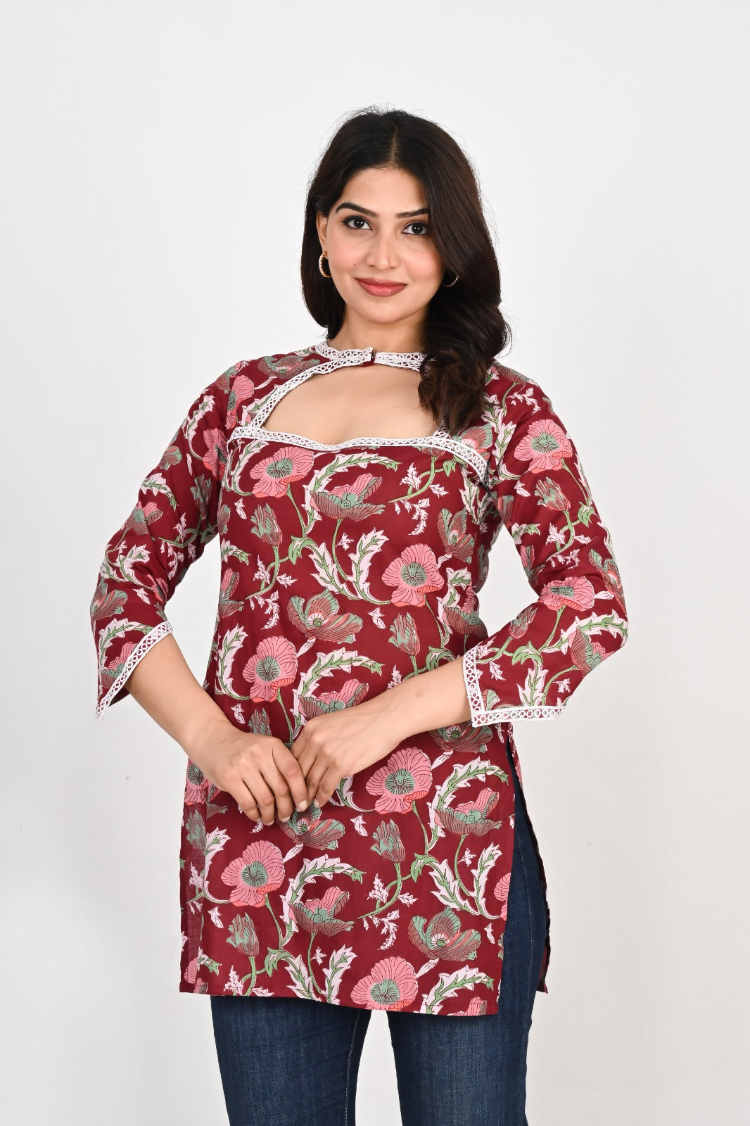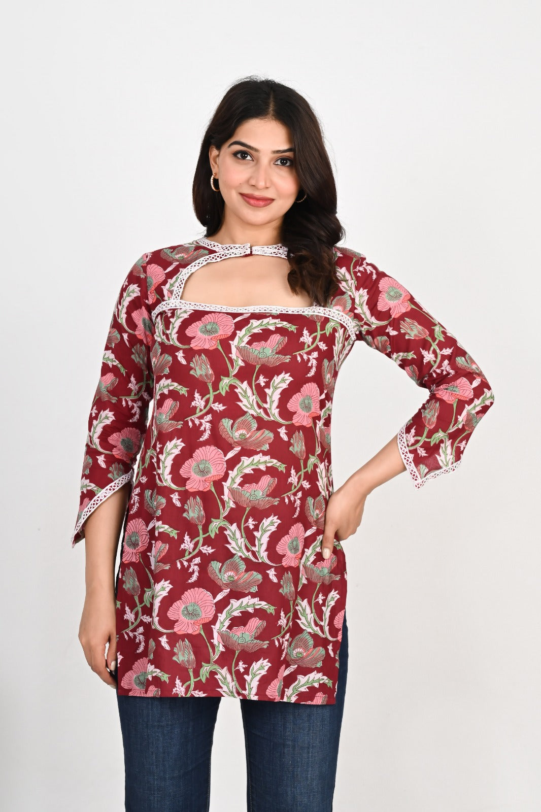 Make a fashion statement with this unique burgundy printed tunic. The rich, dark red base is adorned with a beautiful all-over floral print in shades of pink, green, and white. This top stands out with its modern cutout neckline, which is elegantly trimmed with delicate white lace detailing.
