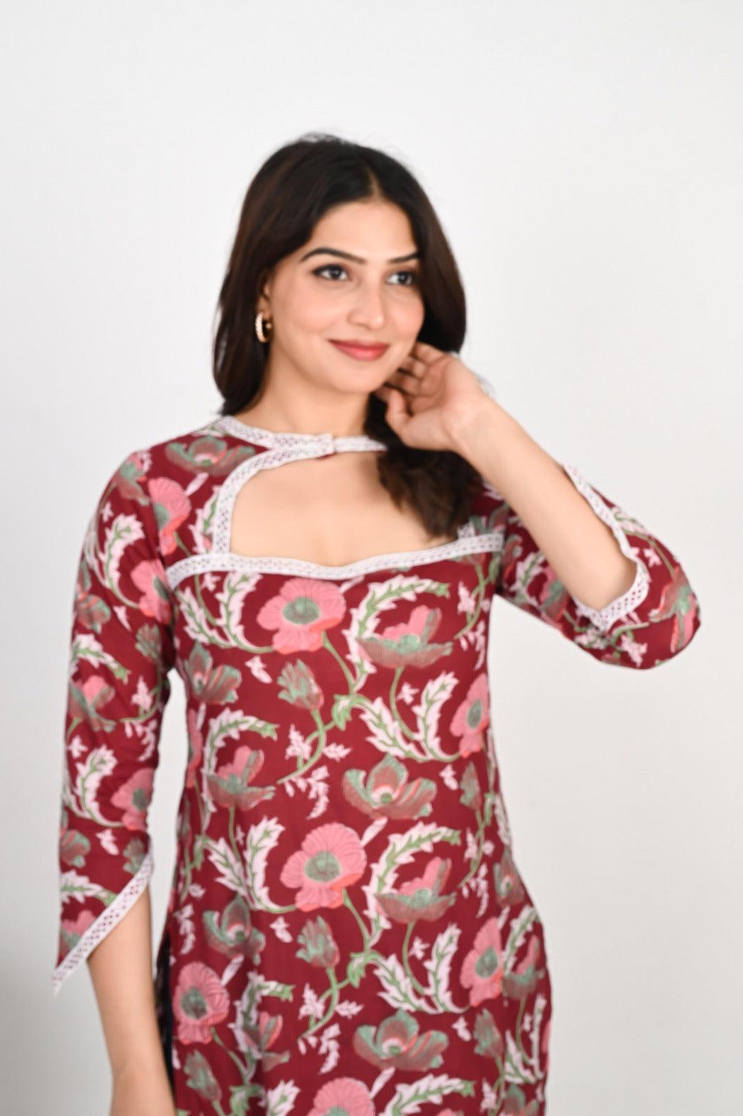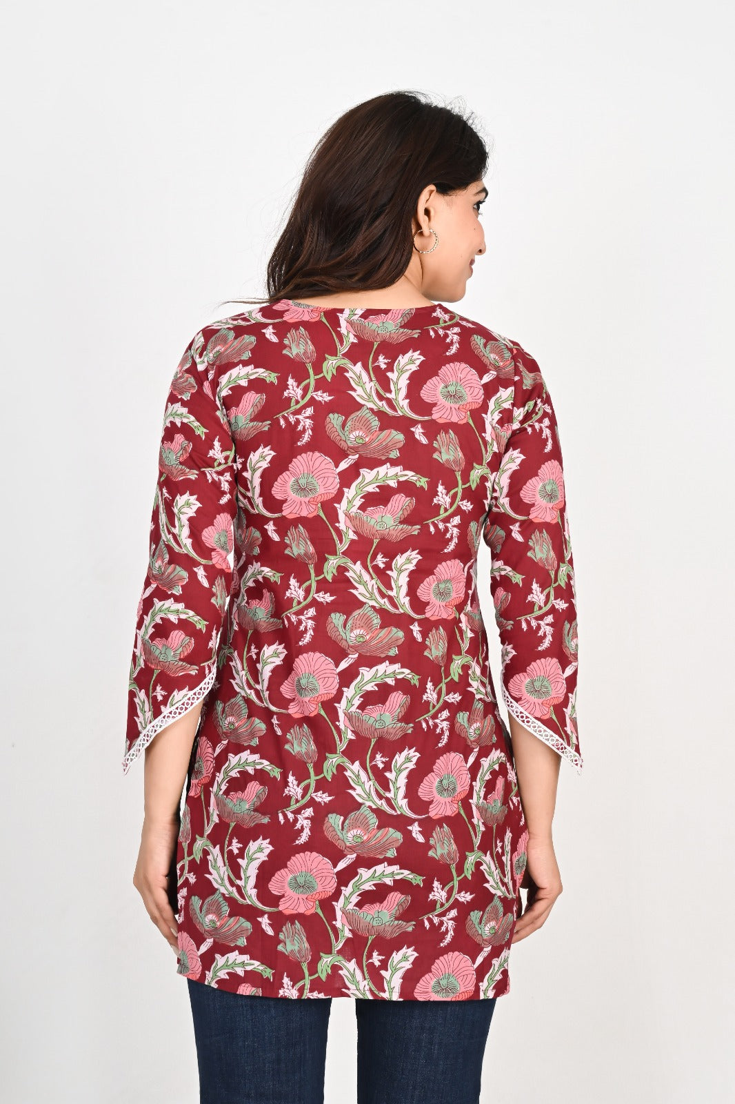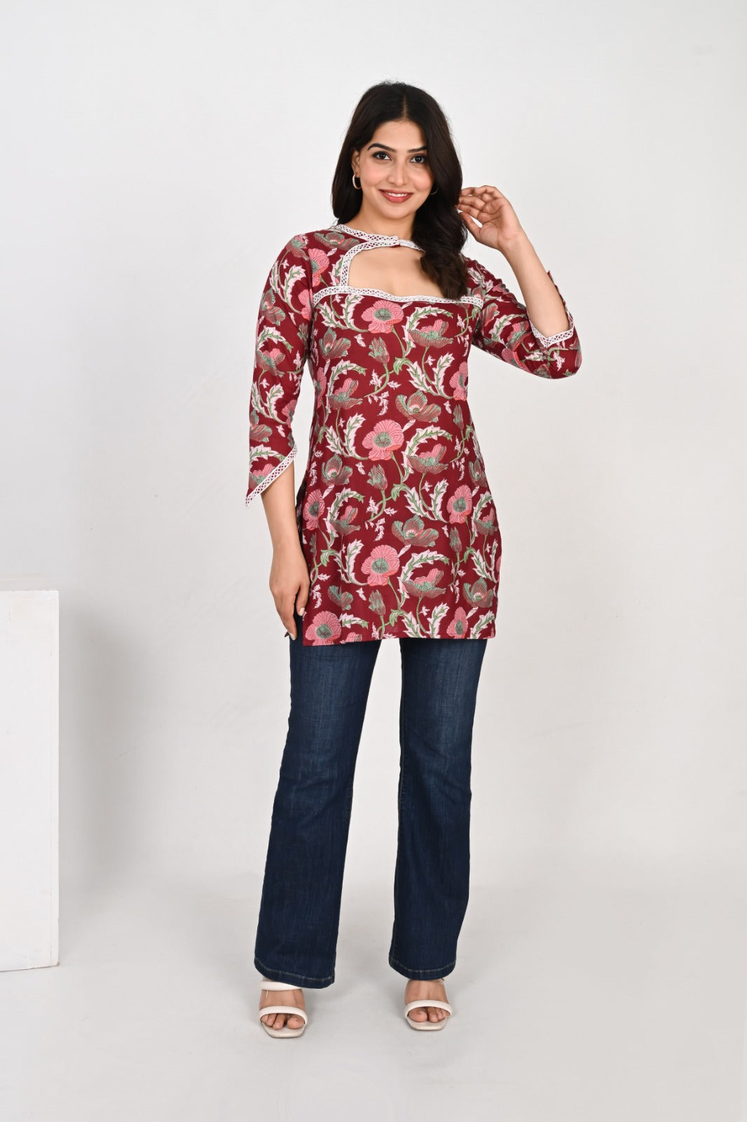 Make a fashion statement with this unique burgundy printed tunic. The rich, dark red base is adorned with a beautiful all-over floral print in shades of pink, green, and white. This top stands out with its modern cutout neckline, which is elegantly trimmed with delicate white lace detailing.
