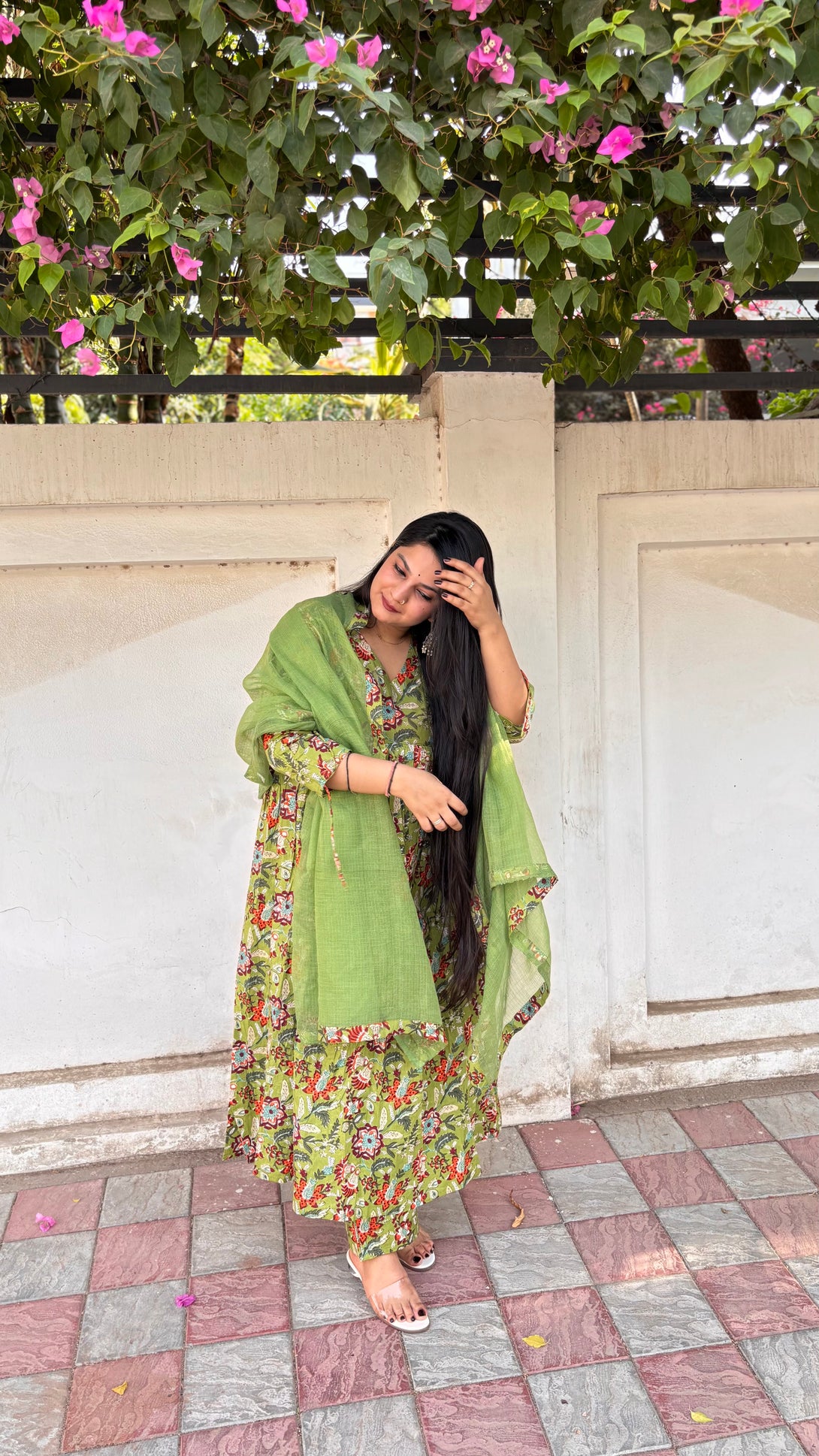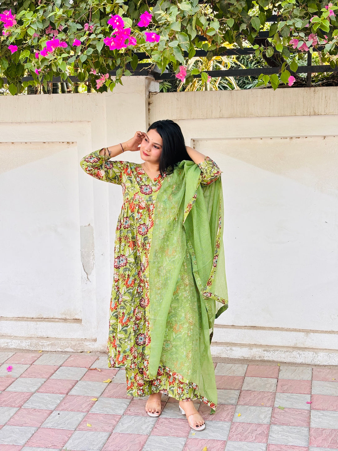 Green Pure Cotton V Neck Floral Kurta Set for Women