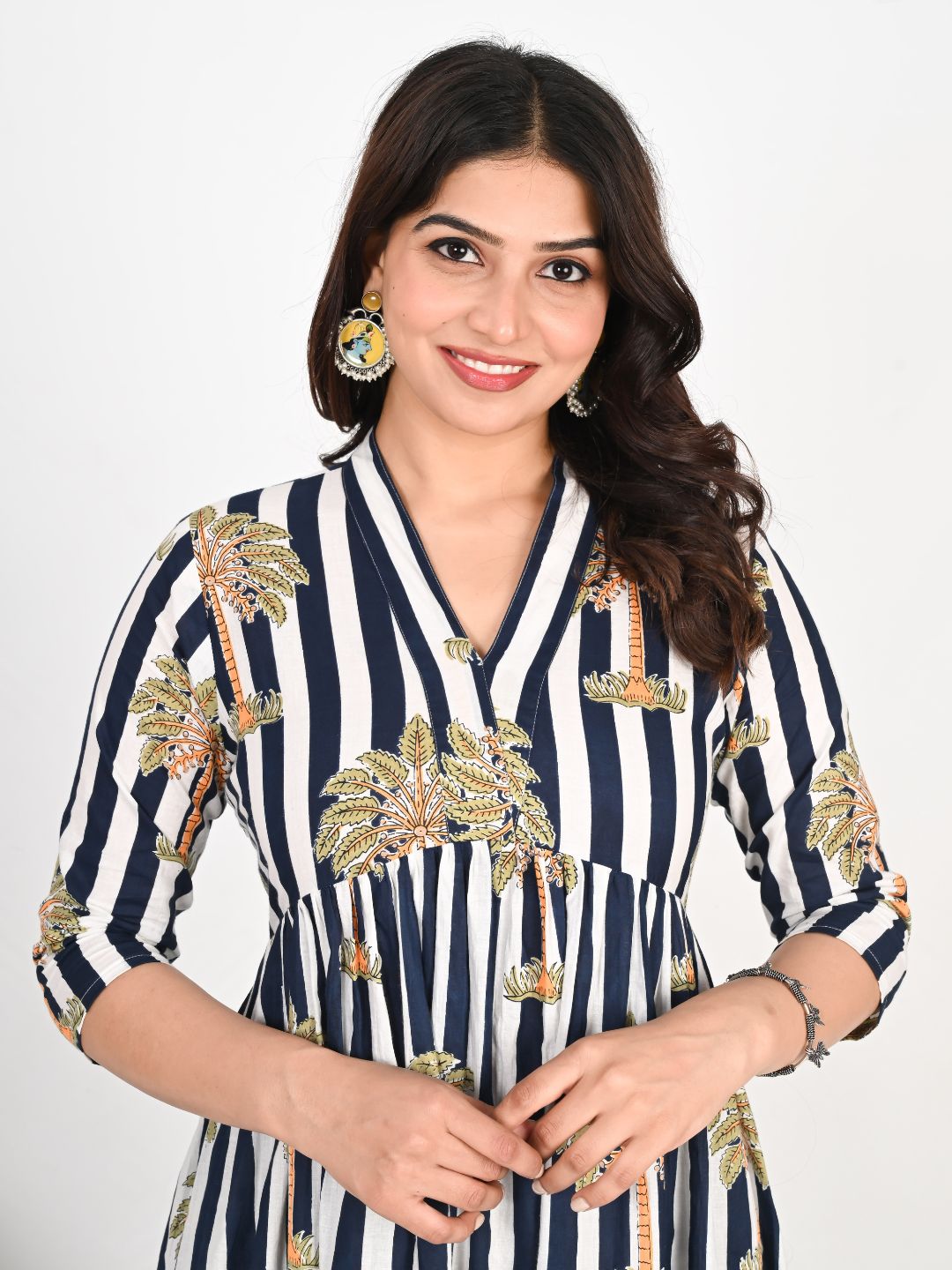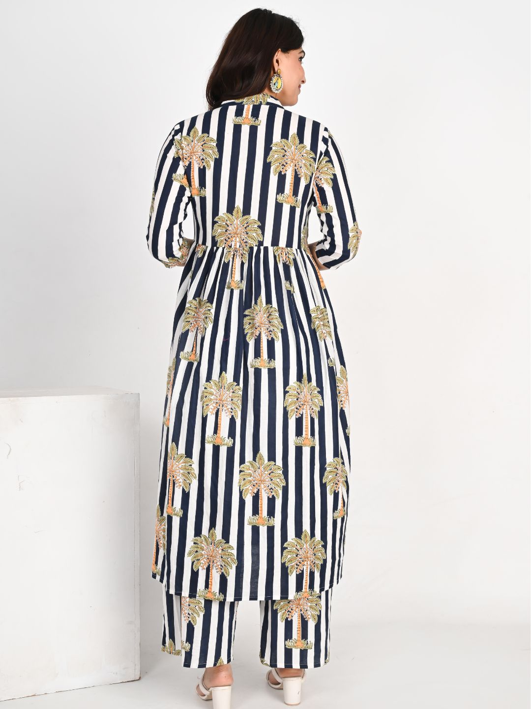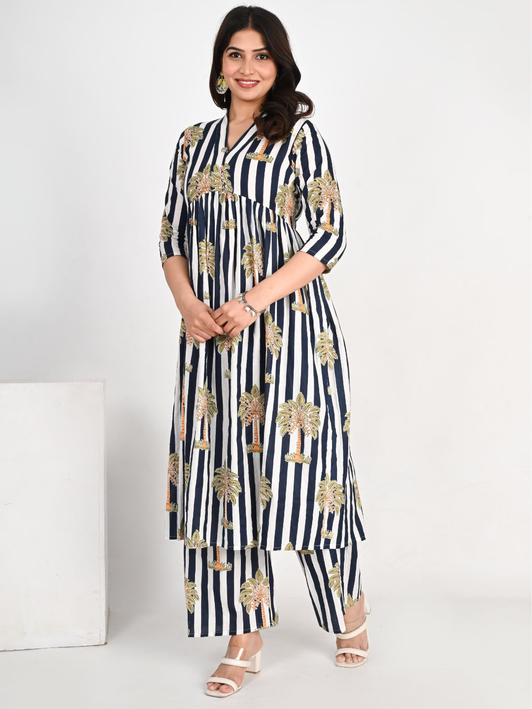 Embrace a blend of nautical charm and tropical vibes with this stylish navy and white striped coord set. The A-line kurta features a flattering V-neckline and three-quarter sleeves, adorned with an eye-catching palm tree print overlaid on the classic stripes. The relaxed fit ensures comfort while maintaining a chic silhouette. The set includes matching striped trousers with the same delightful palm tree motif, creating a perfectly coordinated and fashion-forward look. This ensemble is ideal for casual outings, resort wear, or adding a fresh, summery touch to your wardrobe.