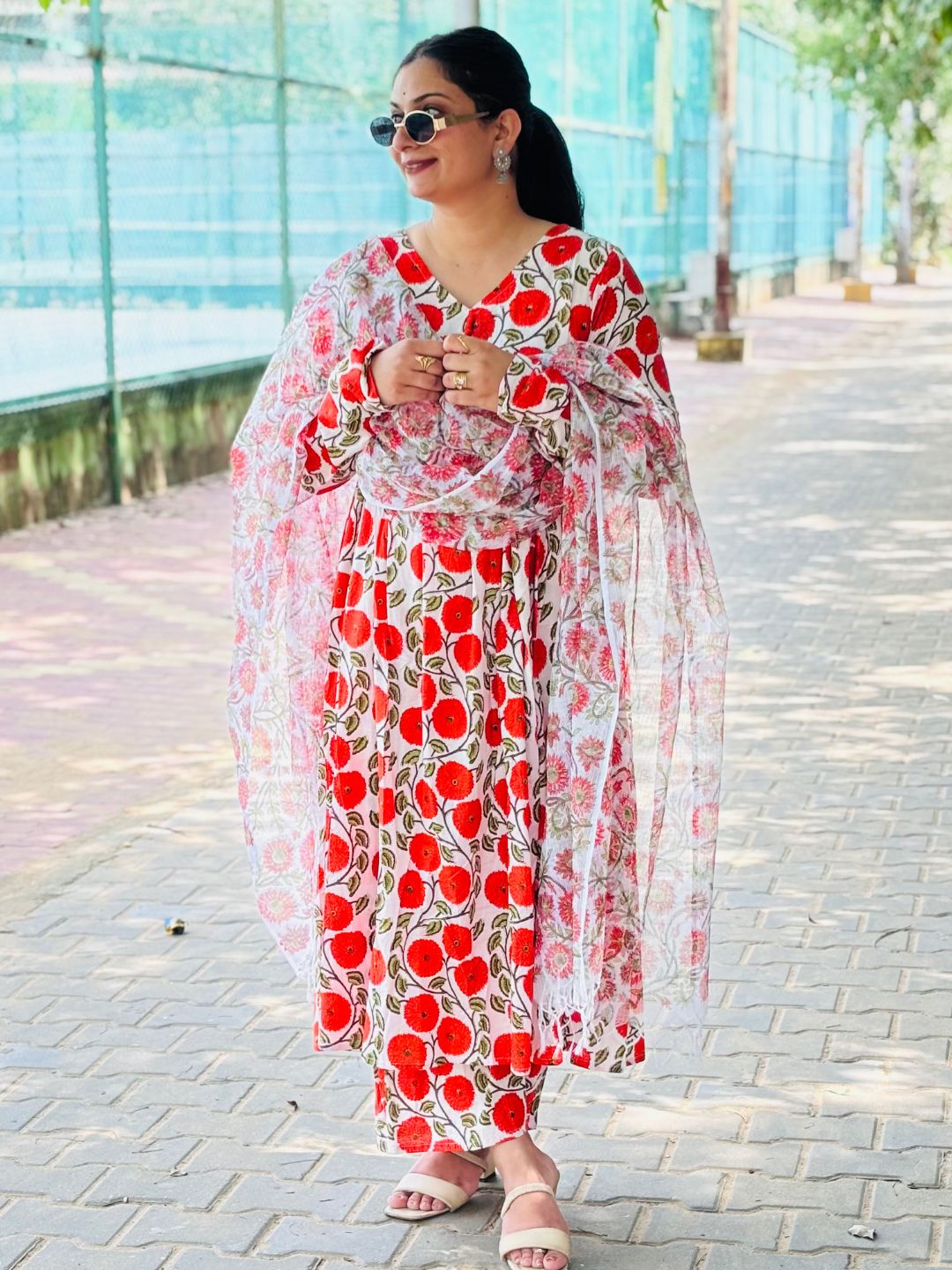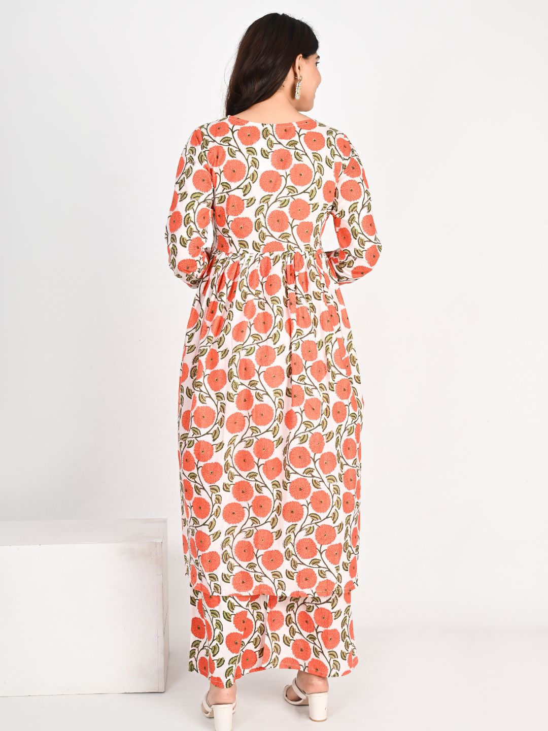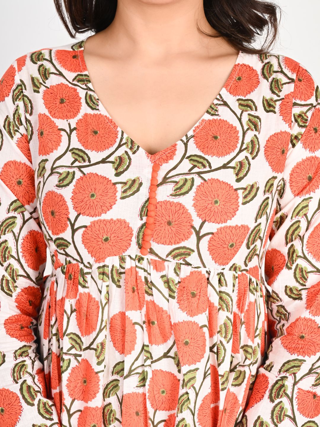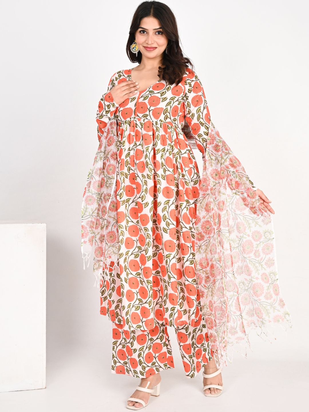 Orange Pure Cotton V Neck Floral Anarkali Kurta Set for Women