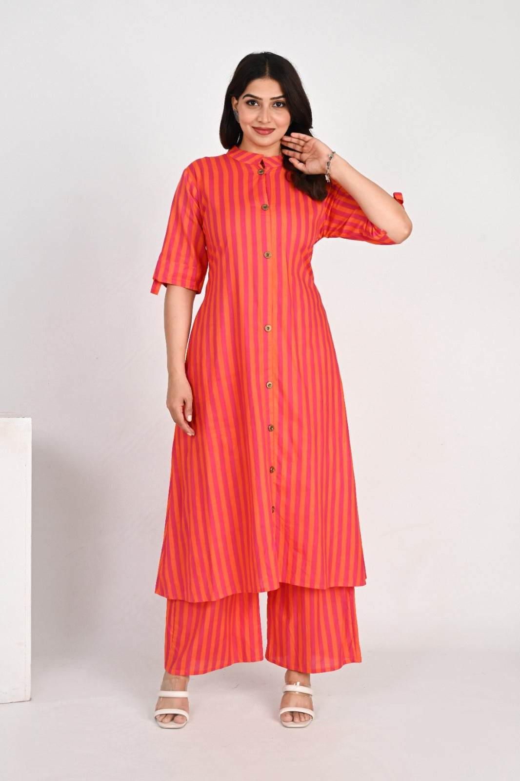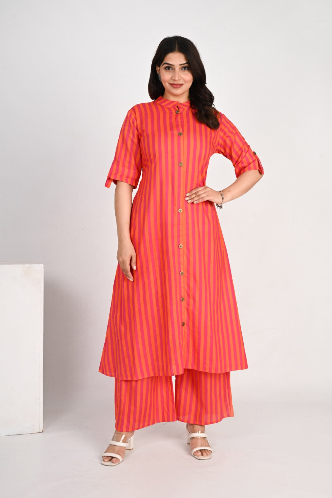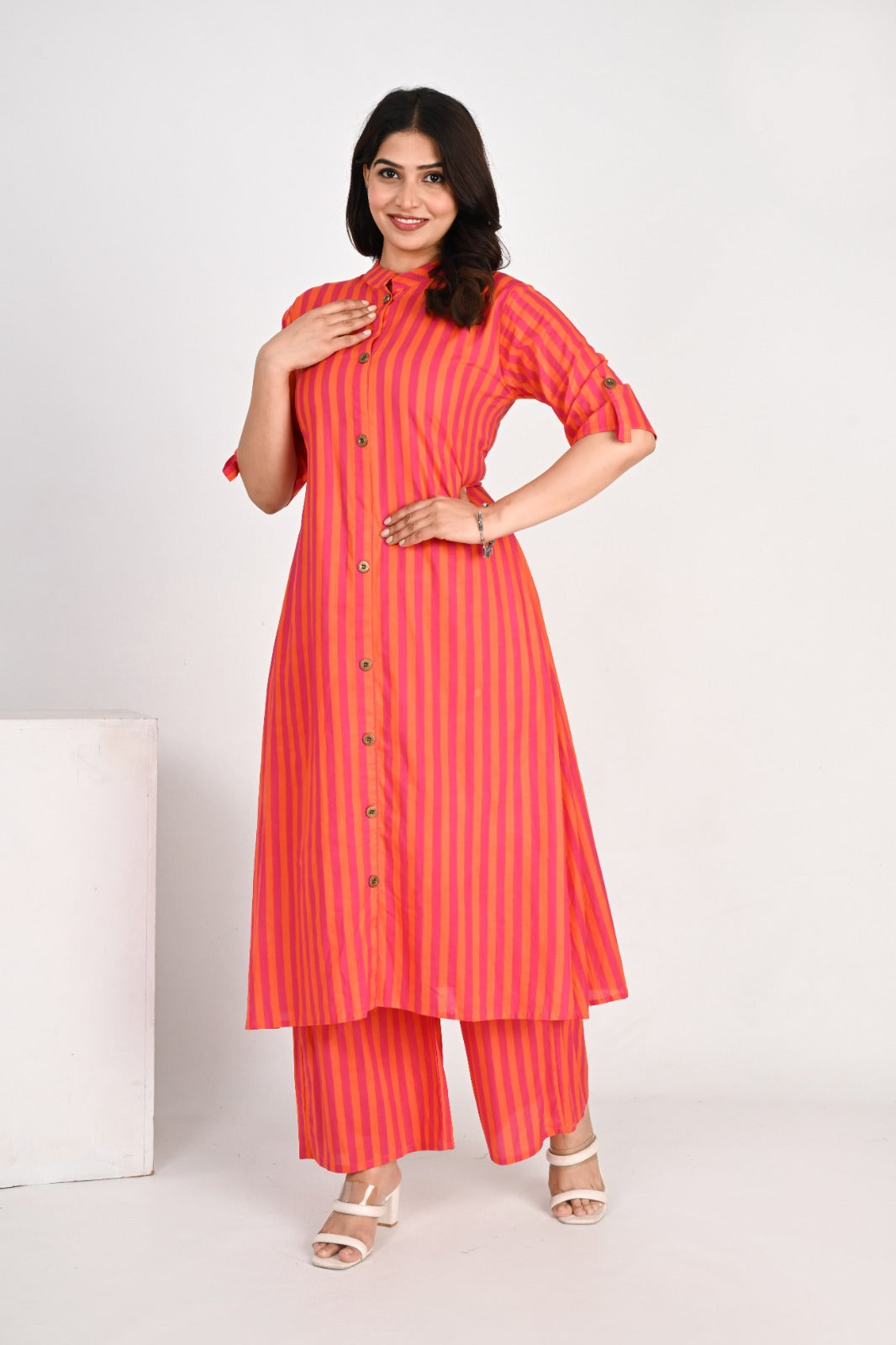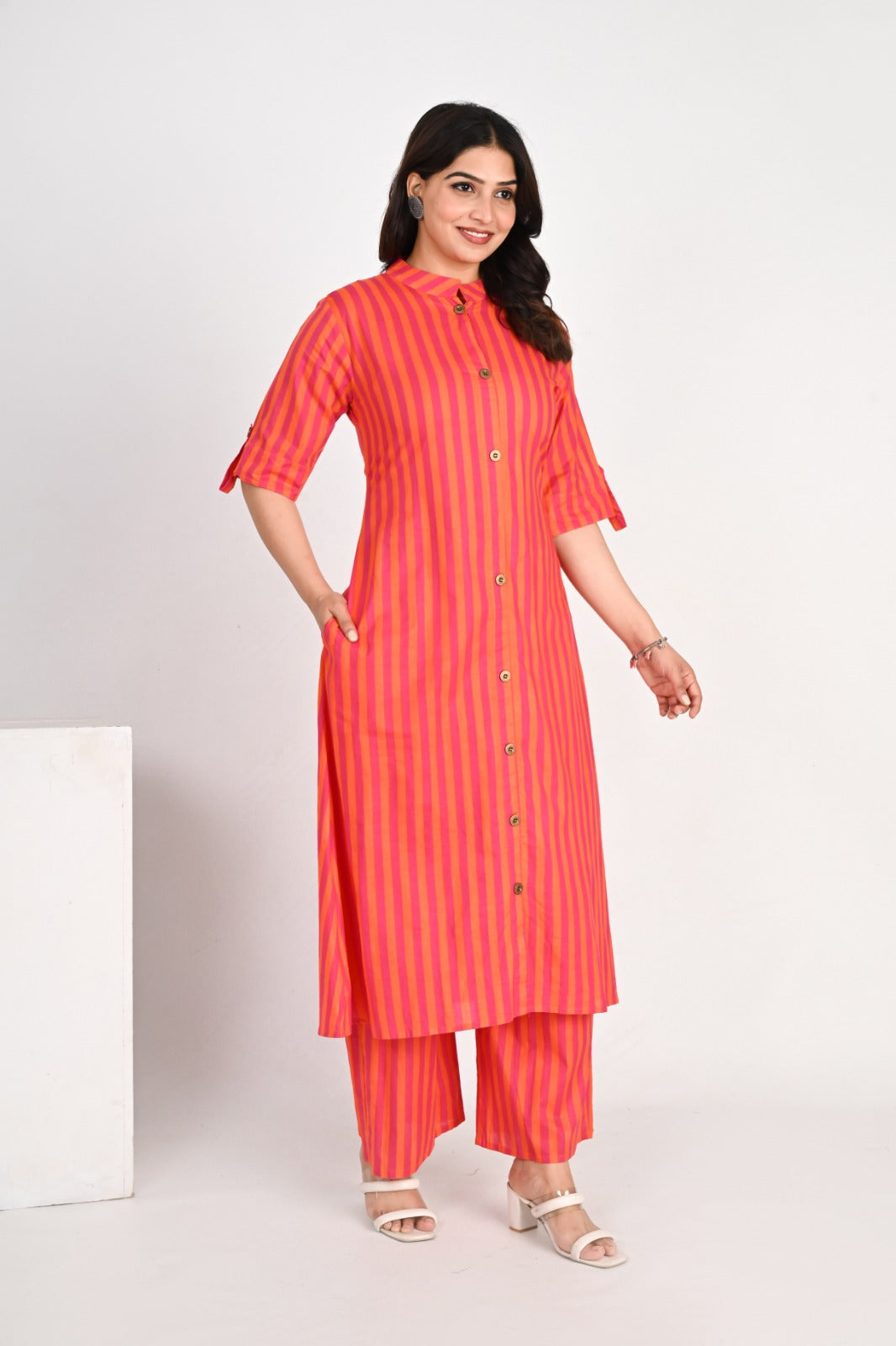Make a bold statement with this vibrant orange and pink striped kurta set. The straight-cut kurta features a classic mandarin collar and a functional front button placket. The high-low hemline and tie-up details on the sleeves add a modern touch to the design. Paired with matching striped wide-leg pants, this ensemble creates a striking and coordinated look. Made from a comfortable fabric, this set is perfect for both casual outings and festive events, offering a blend of traditional style and contemporary flair.