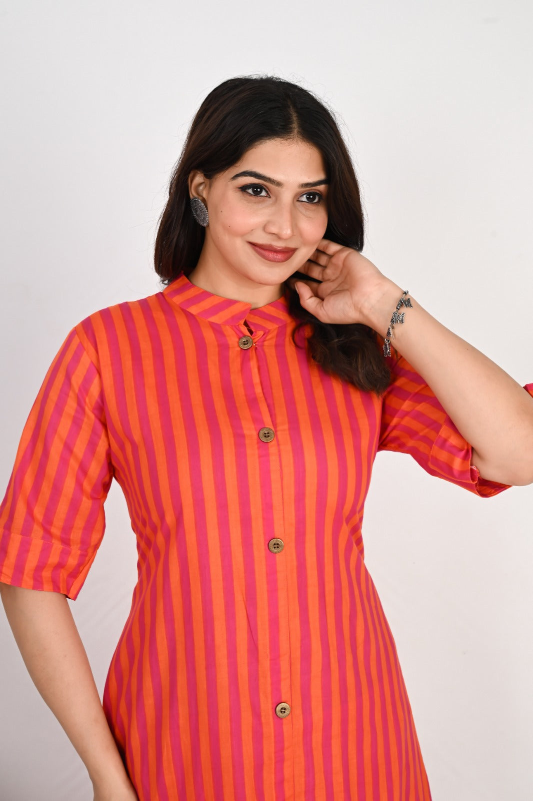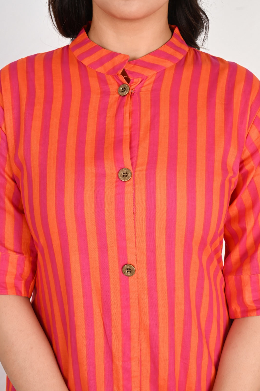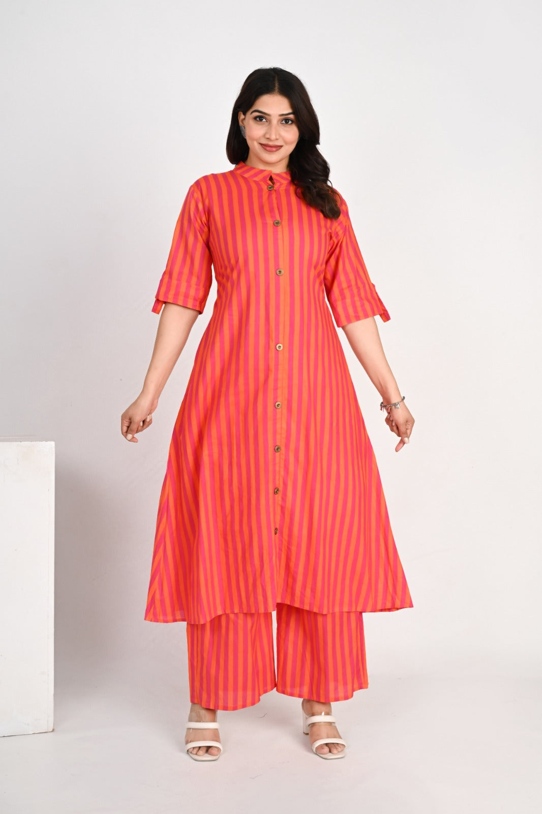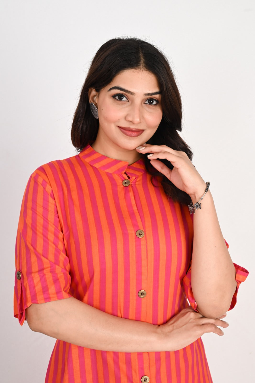 Make a bold statement with this vibrant orange and pink striped kurta set. The straight-cut kurta features a classic mandarin collar and a functional front button placket. The high-low hemline and tie-up details on the sleeves add a modern touch to the design. Paired with matching striped wide-leg pants, this ensemble creates a striking and coordinated look. Made from a comfortable fabric, this set is perfect for both casual outings and festive events, offering a blend of traditional style and contemporary flair.