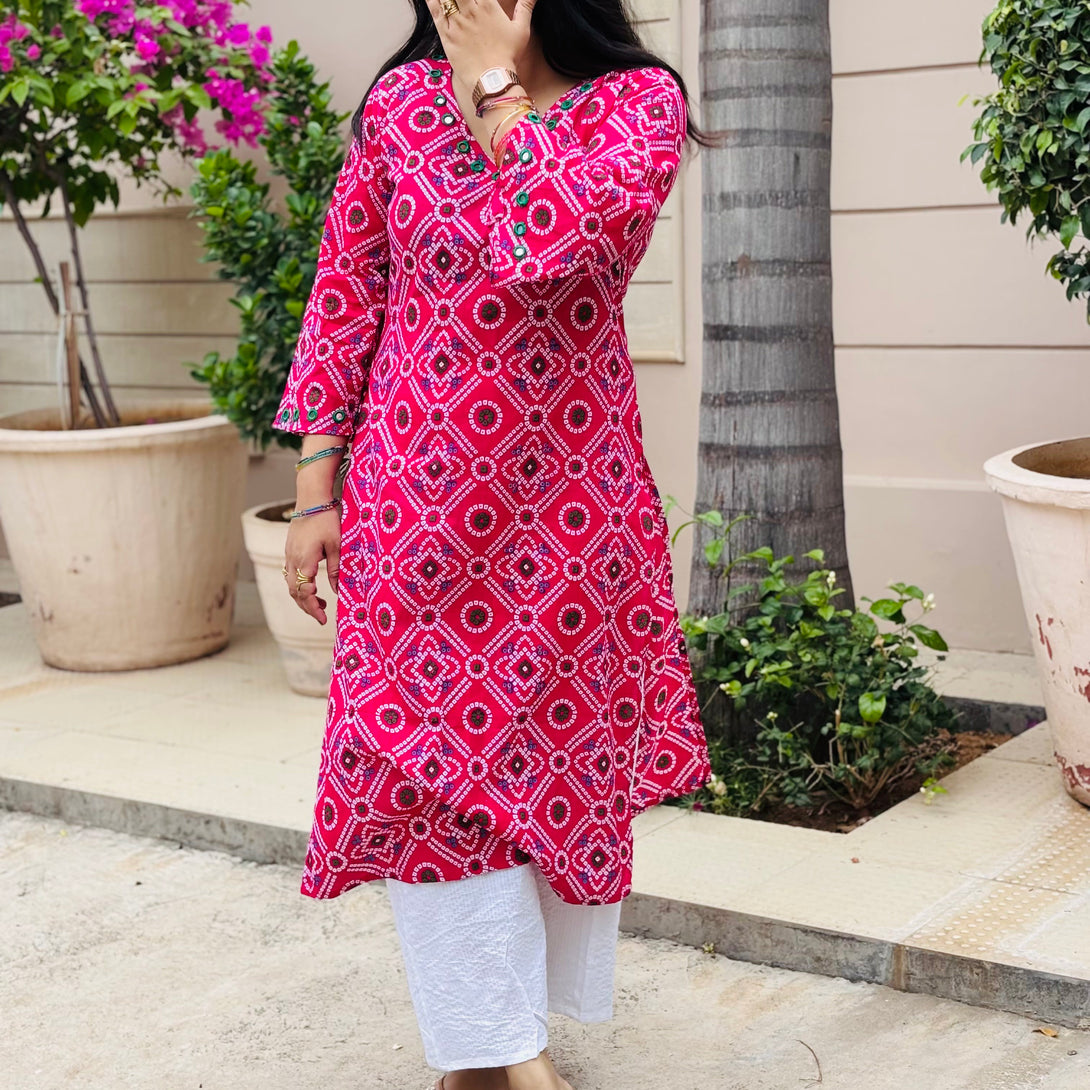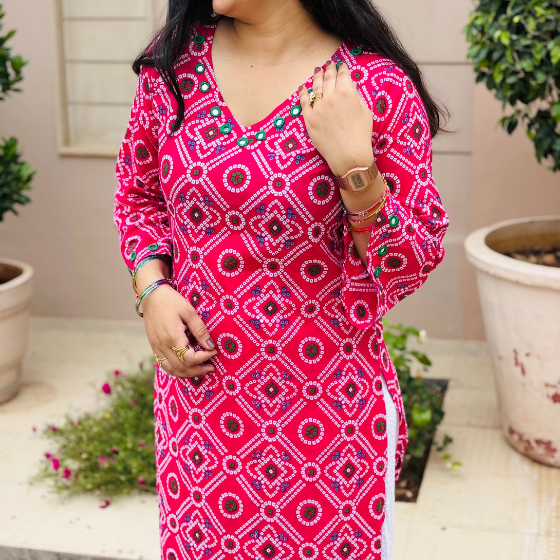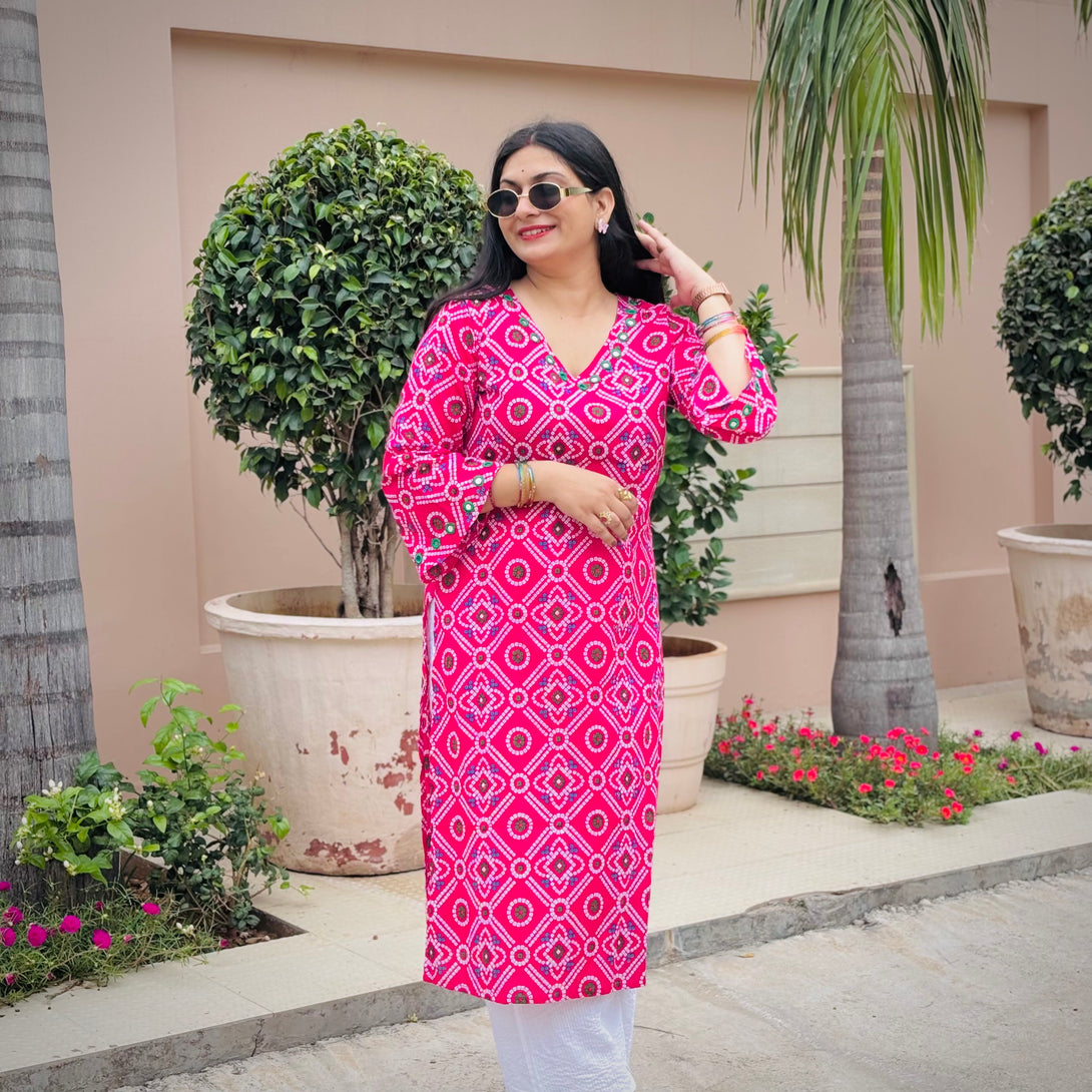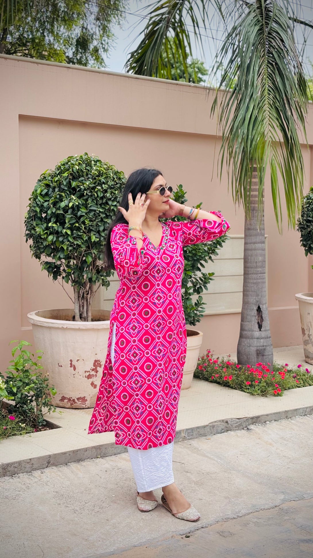 Stand out in style with this stunning hot pink kurta set, perfect for adding a pop of color to your wardrobe. The kurti features a traditional Bandhani-style print in a lovely pattern of white and green, giving it a classic yet modern look. The elegant V-neckline is beautifully accented with intricate embroidery, while the three-quarter sleeves are finished with a delicate border that complements the overall design.