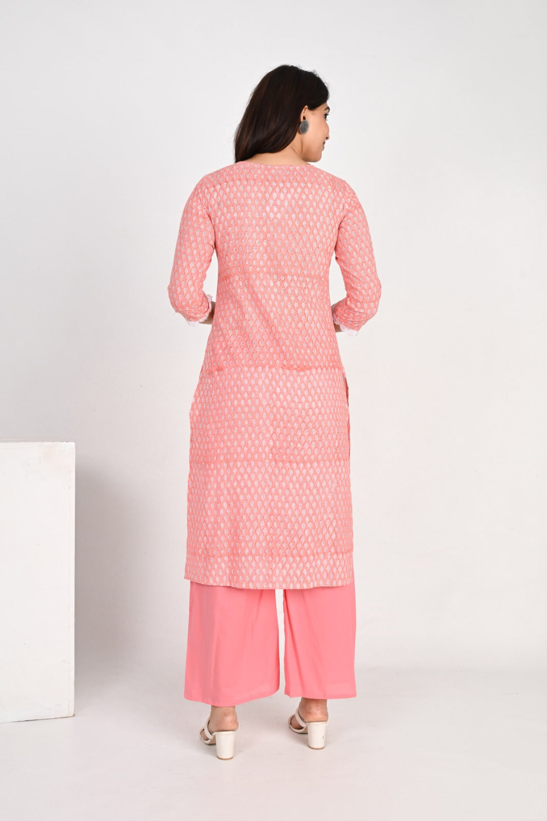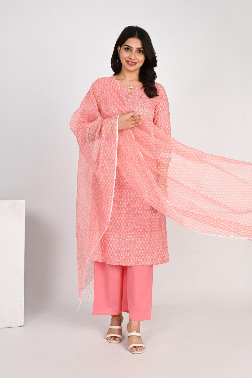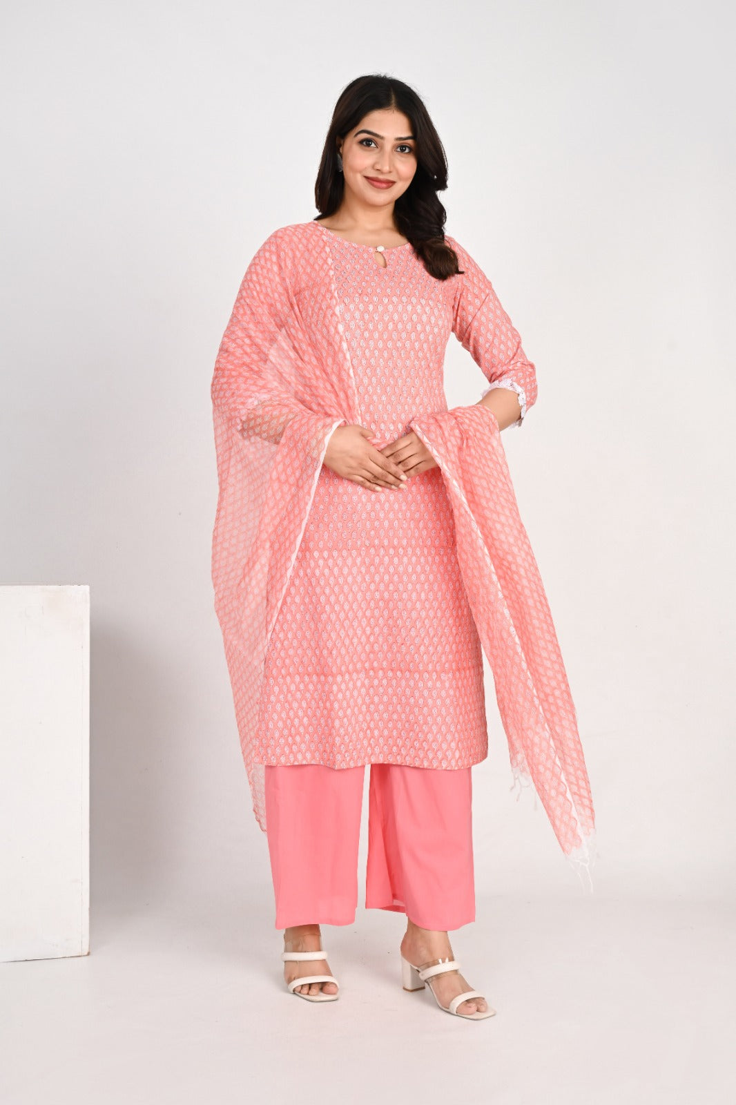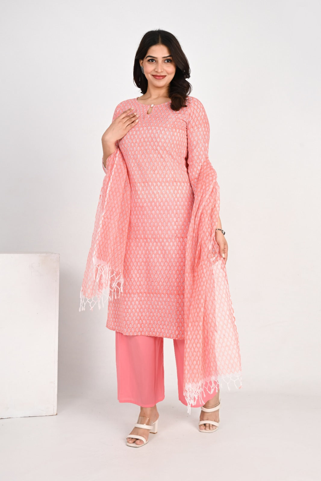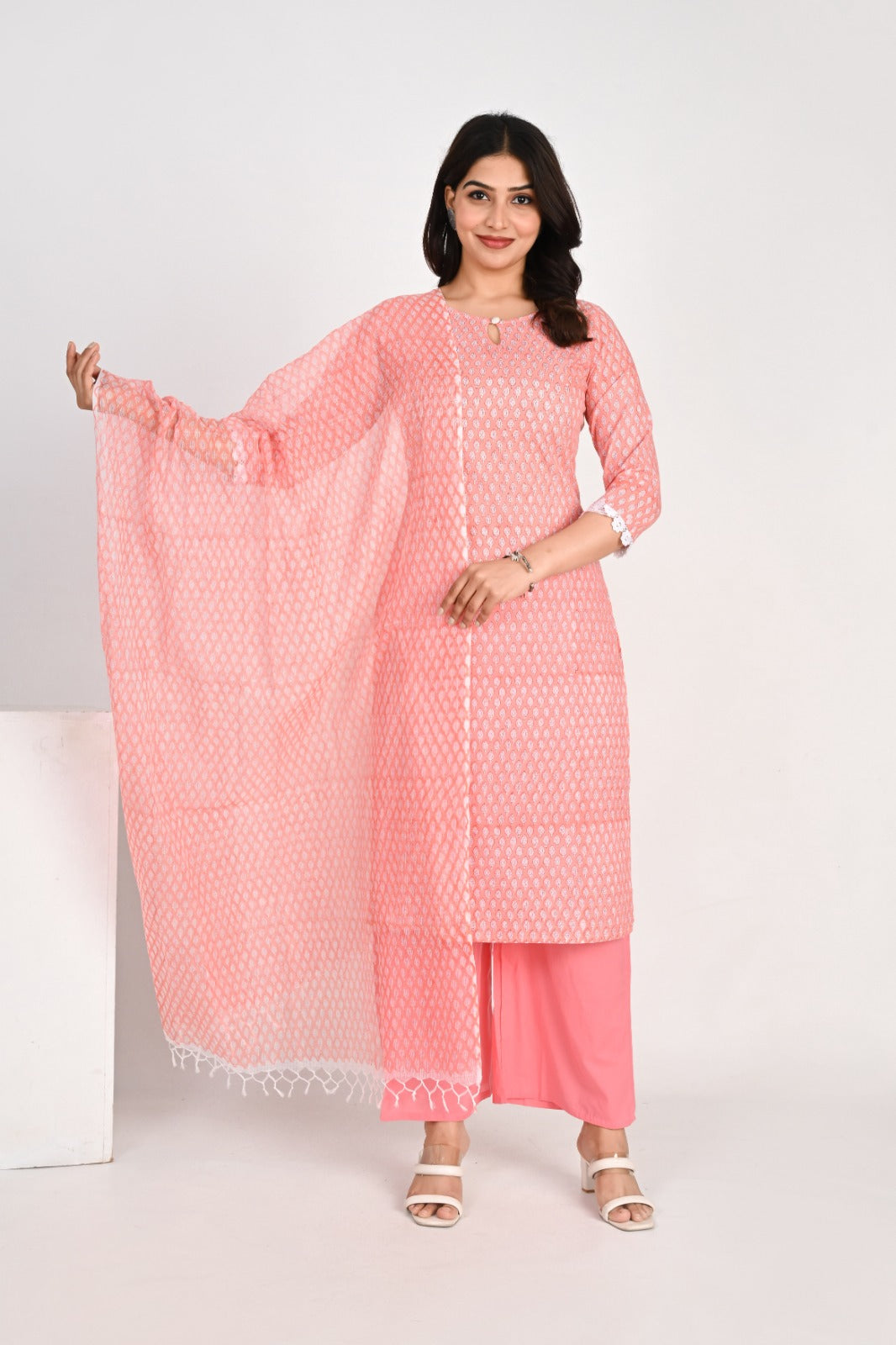 It is paired with solid palazzo pants in a coordinating shade of pink, offering a comfortable and chic silhouette. The set is completed with a matching dupatta that has a beautiful print and fringed edges, tying the whole outfit together. This ensemble is designed for comfort and style, making it ideal for day events, office wear, or a festive gathering.