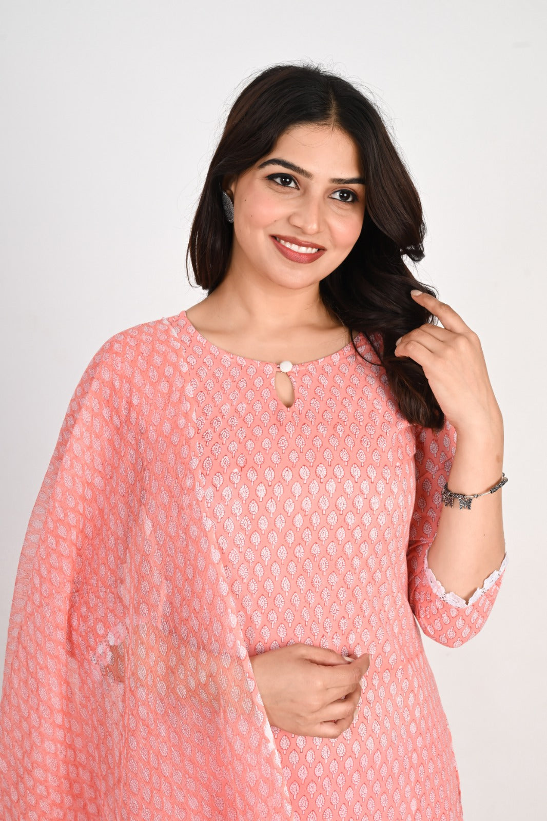 Peach Cotton Printed Kurta Palazzo Set with Bell Sleeves and doria Dupatta