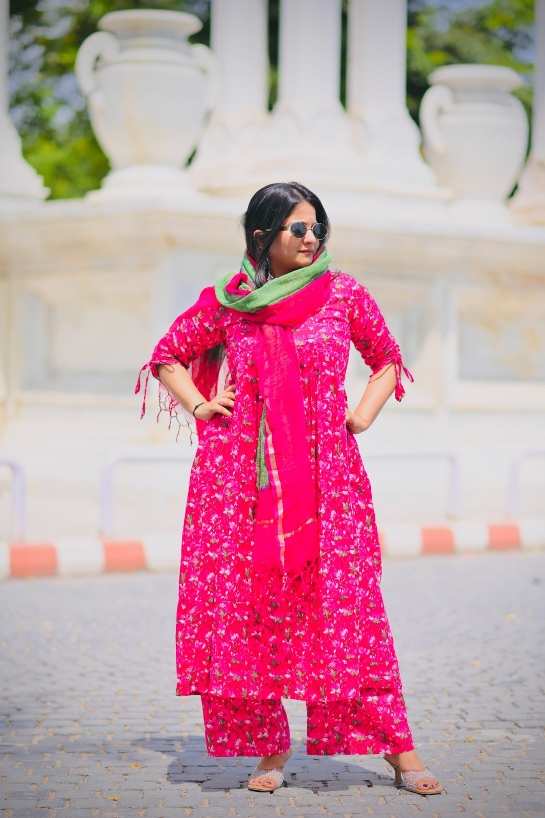 Pink Flower Printed V-Neck Cotton Kurta Set with Duotone Dupatta