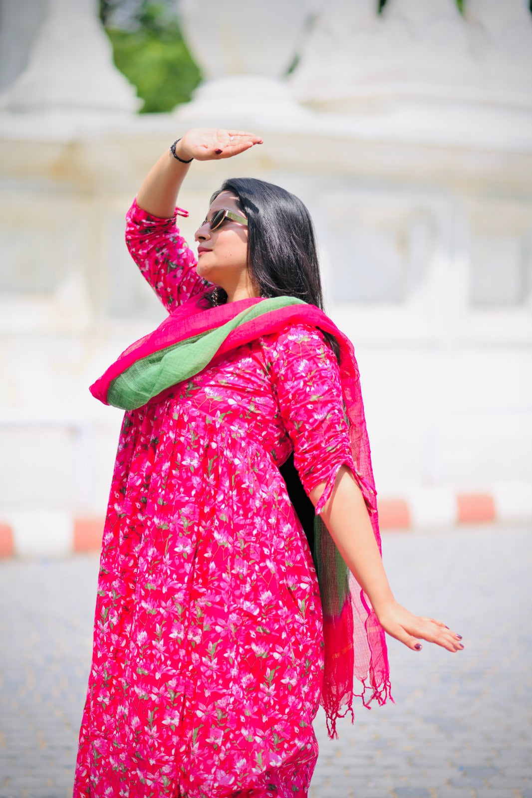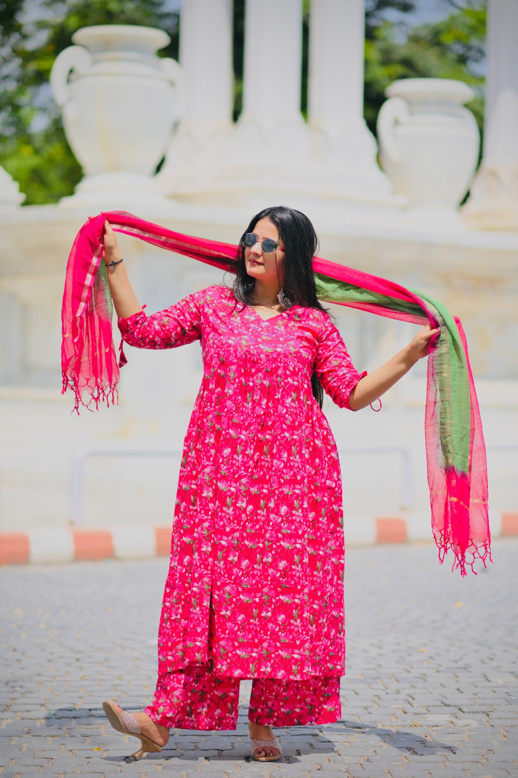 Ignite your style with our "Fuchsia Fiesta" Kurta Set, a vibrant three-piece ensemble designed to make you stand out! Crafted from soft, breathable cotton, this set ensures utmost comfort without compromising on flair. The anarkali-style kurta is a celebration of color, featuring an intricate handblock print of delicate florals and leaves in lighter pinks and greens against a rich, electrifying fuchsia background. Its graceful flared silhouette, combined with subtle gathers at the yoke, offers a flattering and elegant drape.