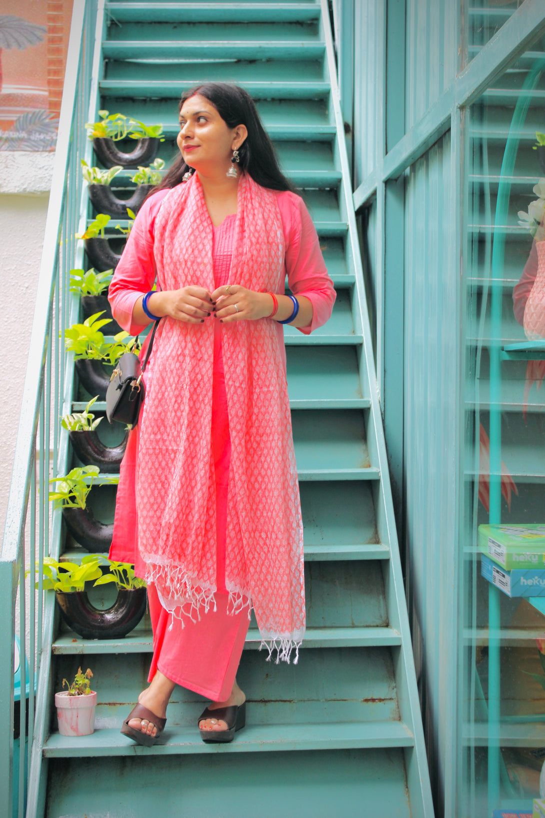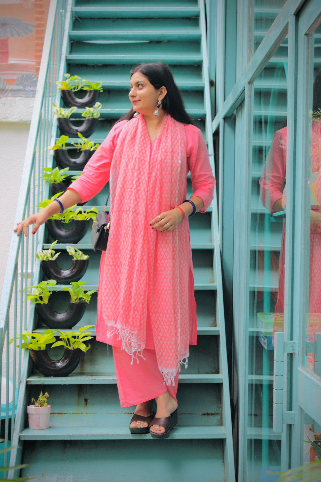 Pink Pure Cotton V Neck Solid Kurta Set for Women