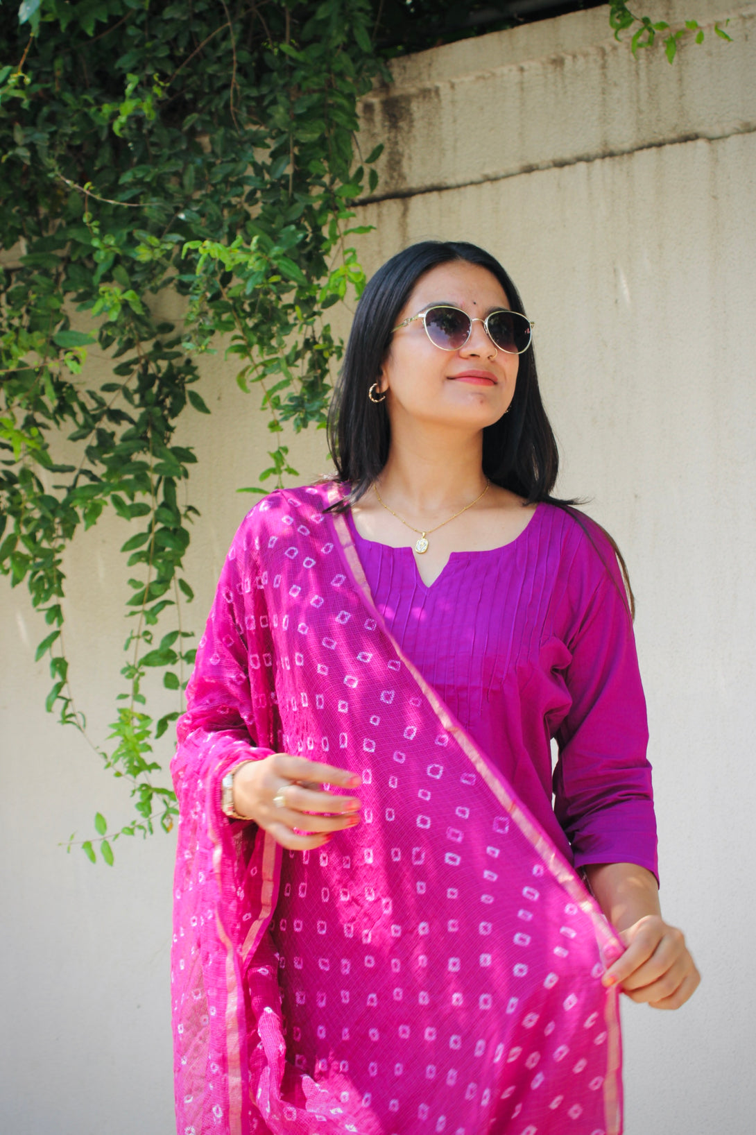 Purple Solid Cotton Kurta Set with Bandhani doria Dupatta