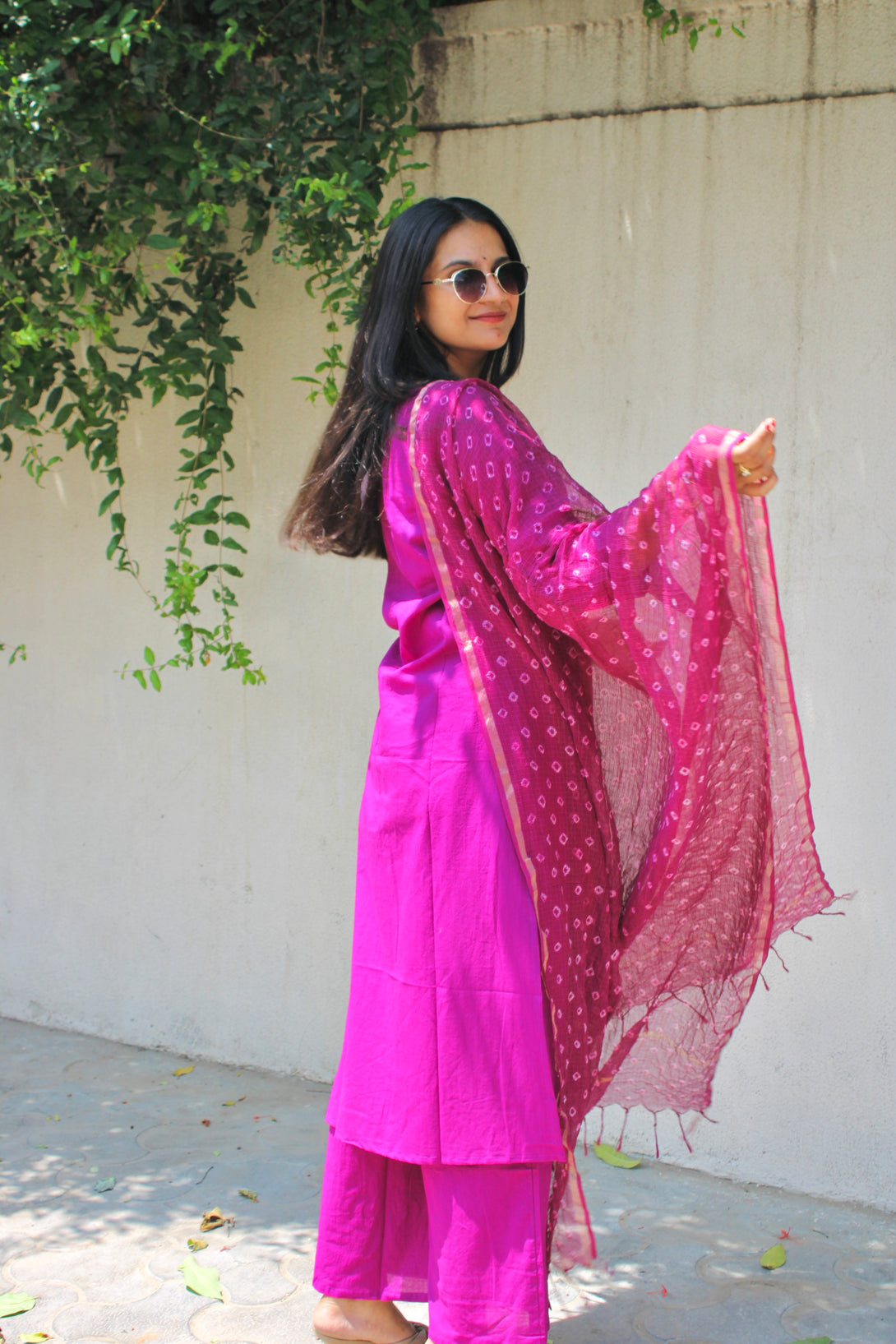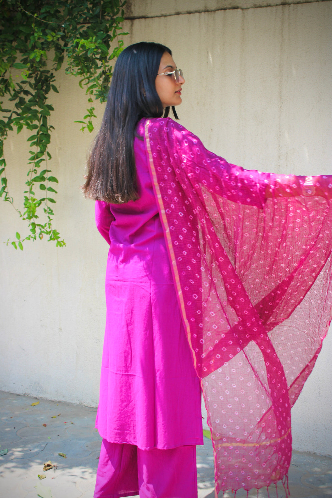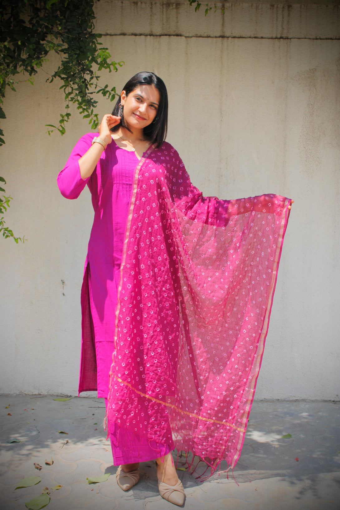 Make a bold and beautiful statement in our "Amethyst Bloom" Kurta Set. This elegant three-piece ensemble is made from a soft, comfortable cotton-blend fabric in a rich, vibrant fuchsia (rani pink) shade. The classic straight-cut kurta features delicate pintuck detailing on the yoke, adding a touch of subtle sophistication. The simple, solid kurta and matching pants are beautifully complemented by a lightweight, sheer dupatta adorned with a traditional bandhani print. This set is perfect for festive gatherings, evening events, or any occasion where you want to stand out with grace and style.