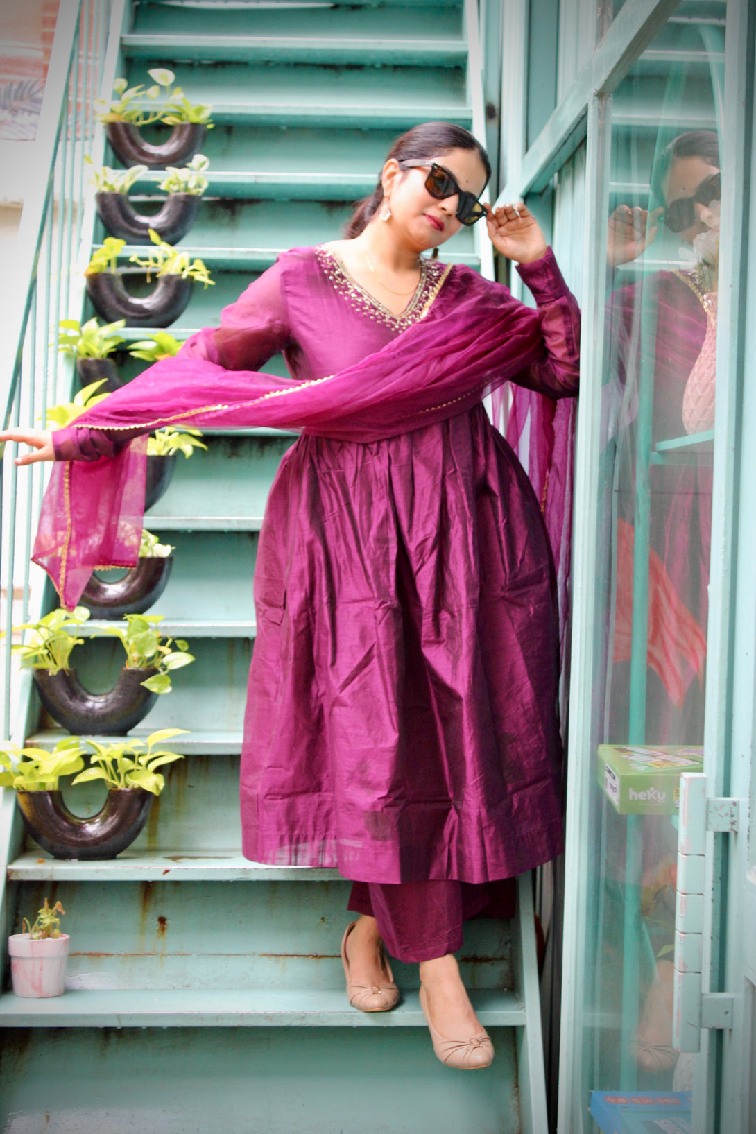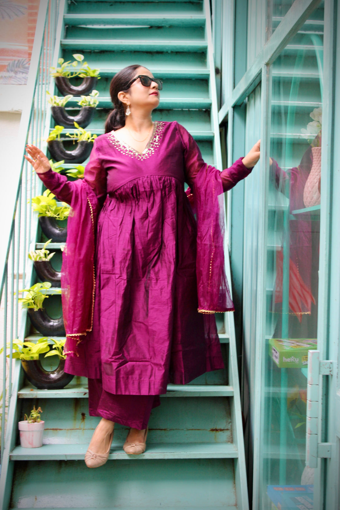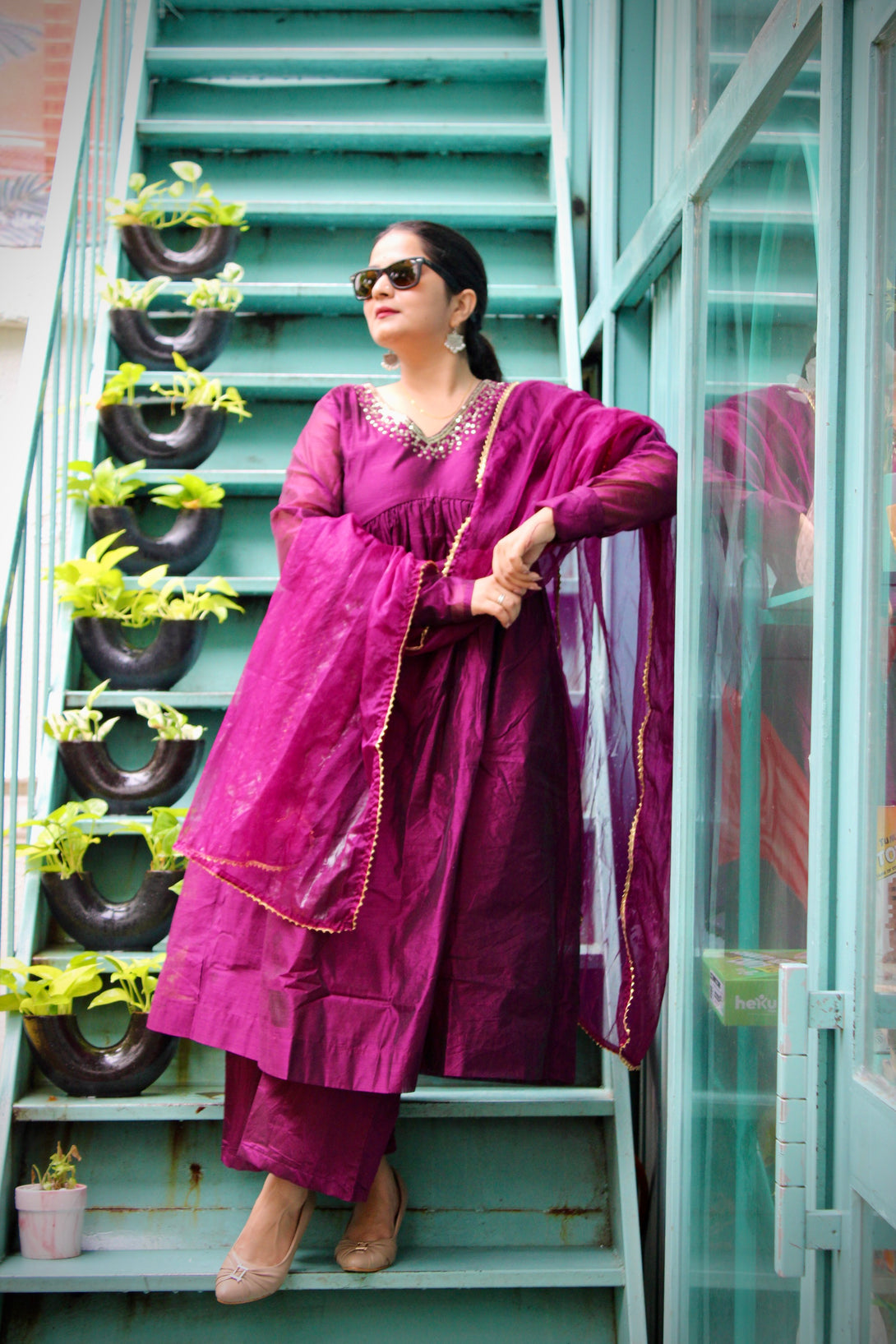 Purple Pure Chanderi V Neck Solid Kurta Set for Women