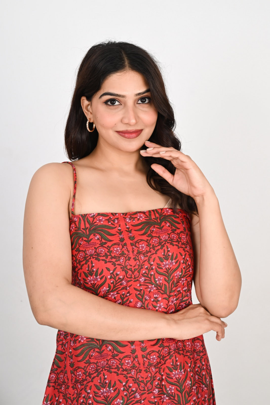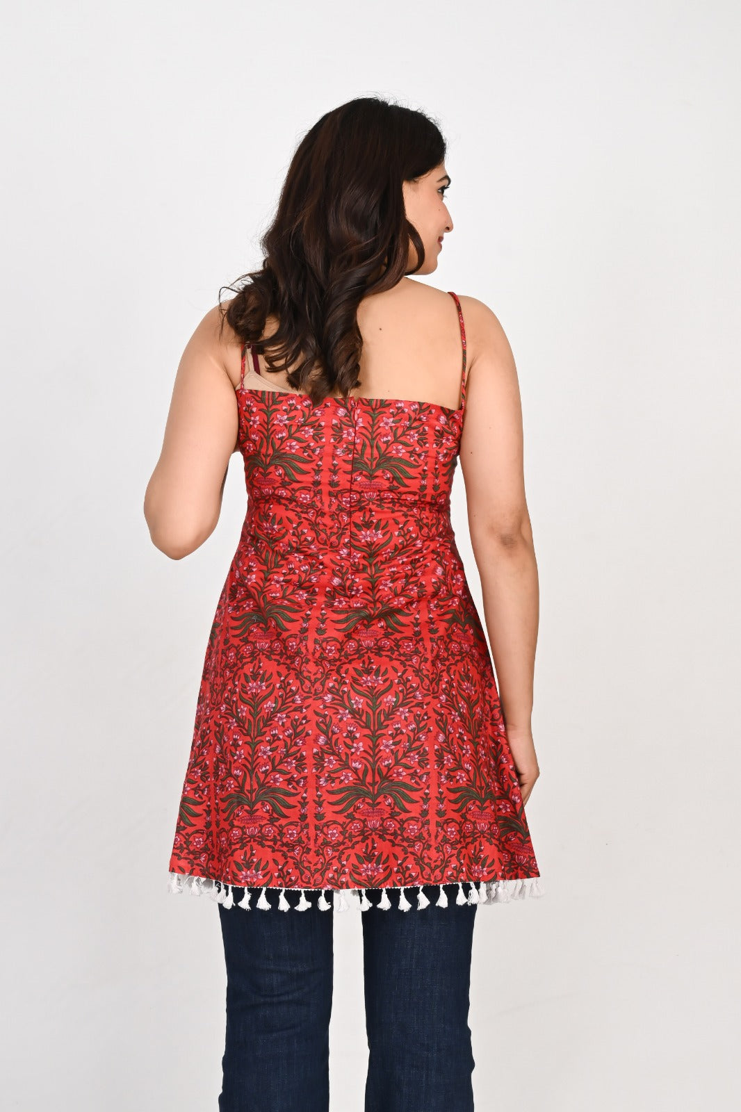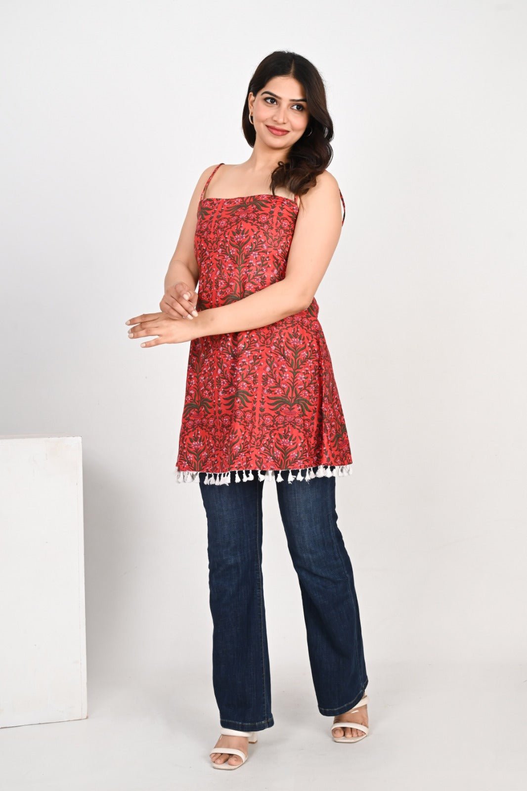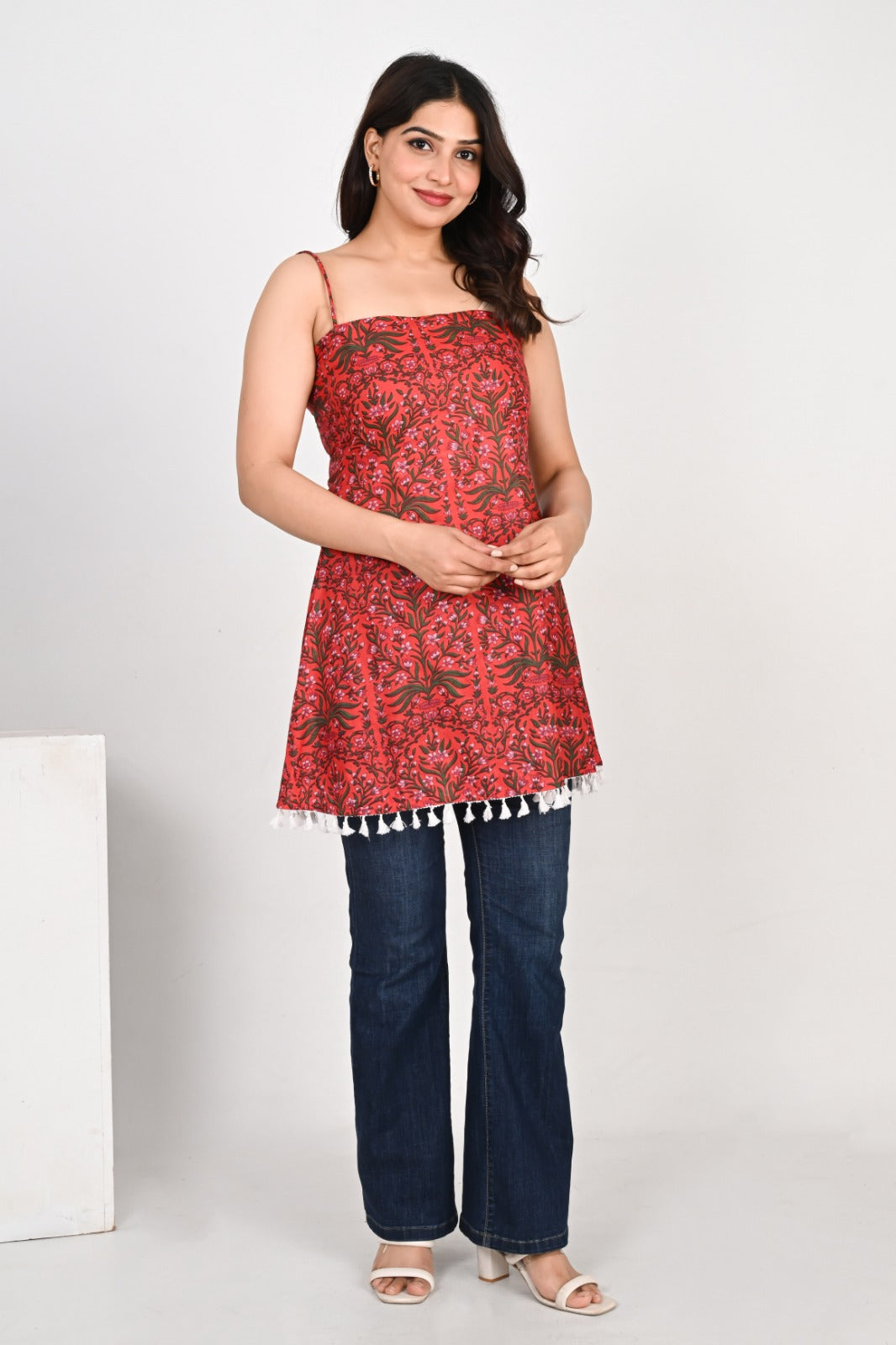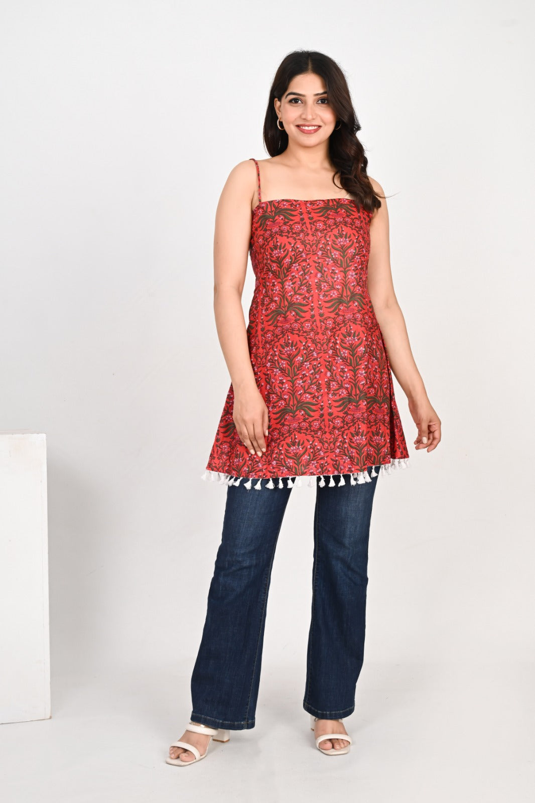 Embrace vibrant summer style with this charming red floral printed tunic. This delightful top features delicate spaghetti straps and a flattering A-line silhouette, making it perfect for warm weather. The all-over intricate floral pattern, in shades of green and dark red, creates a rich and eye-catching design against the bright red base.