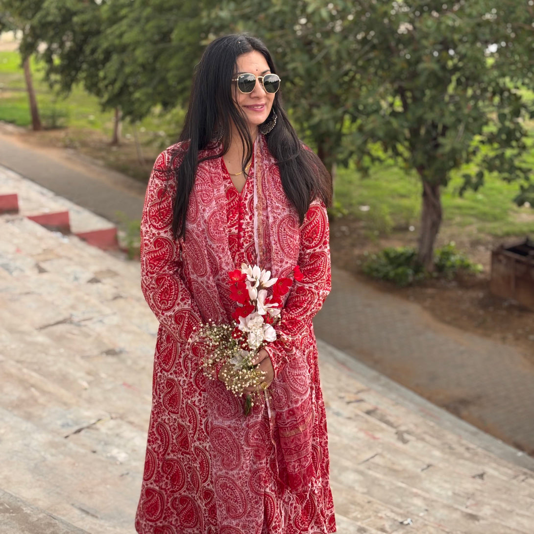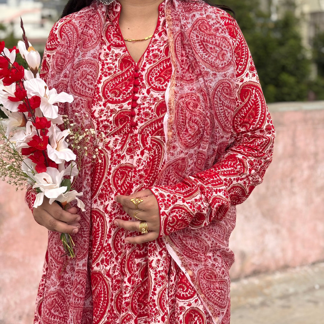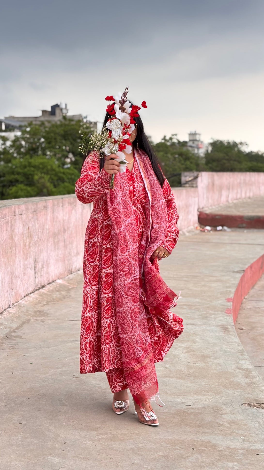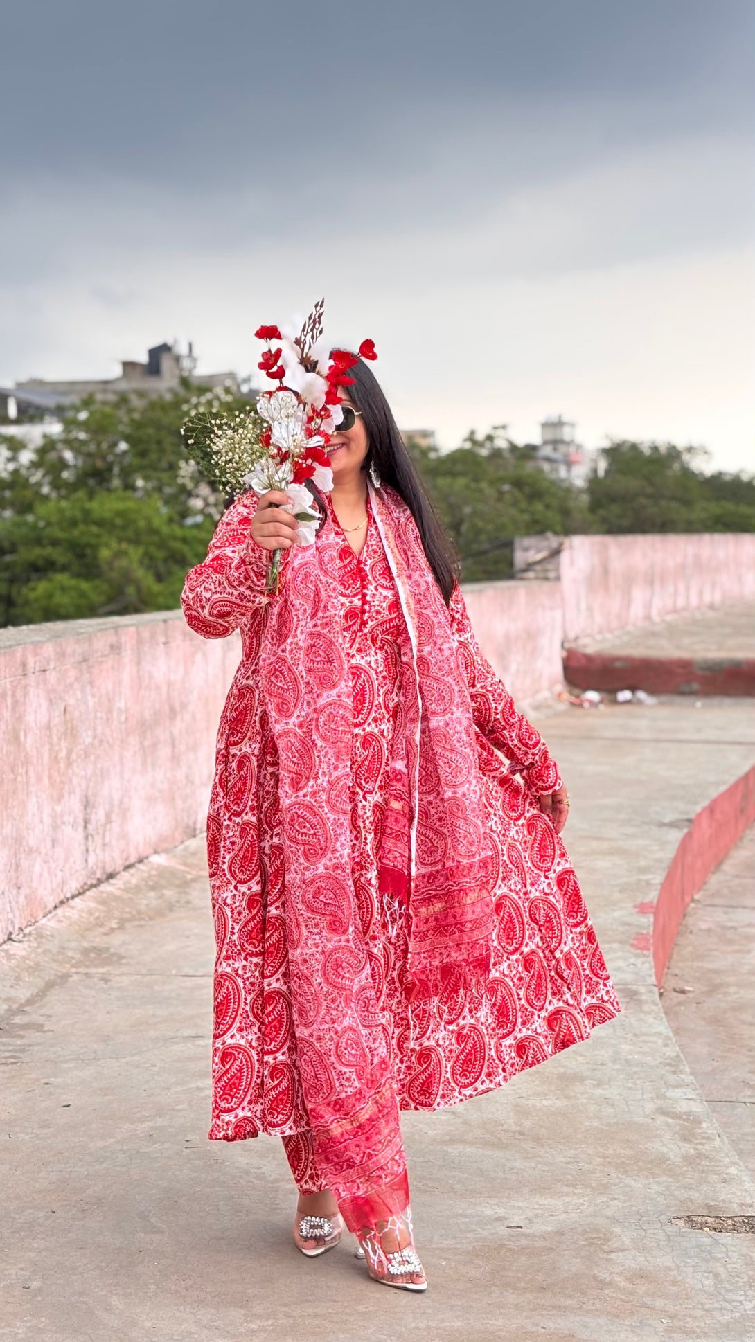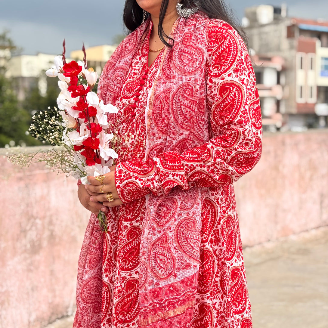 Make a stunning statement in this beautiful red and white paisley print Anarkali suit set. The full-length, flared Anarkali kurta is adorned with a captivating all-over paisley pattern, creating a rich and classic look. It features a comfortable V-neckline and long sleeves, with a flared silhouette that offers graceful movement and a flattering fit for all body types.