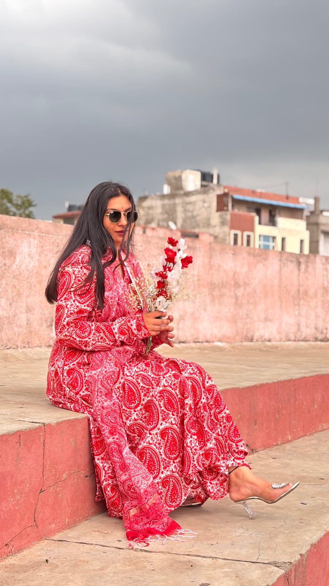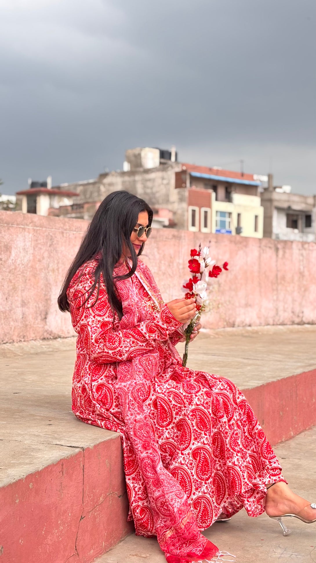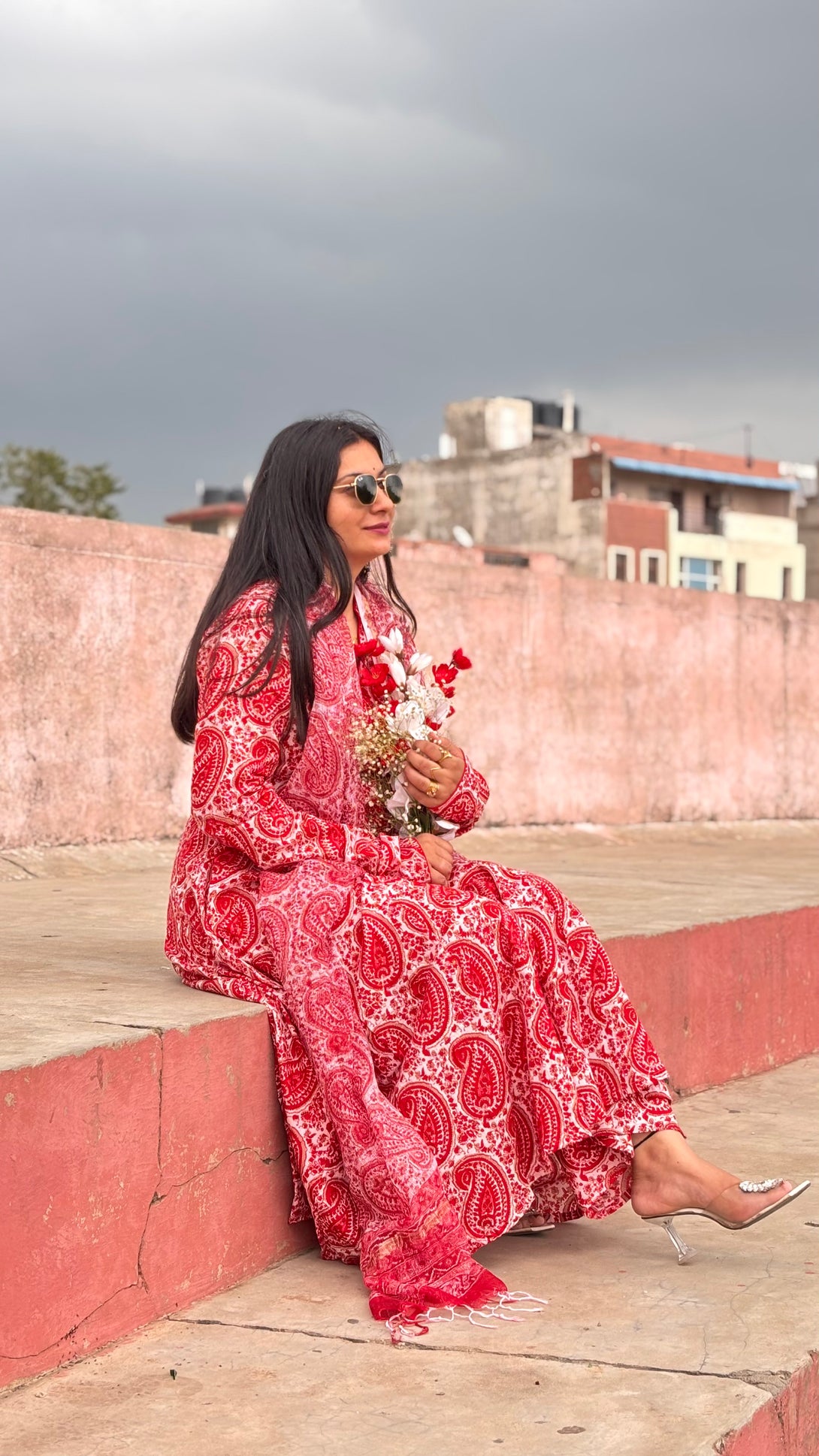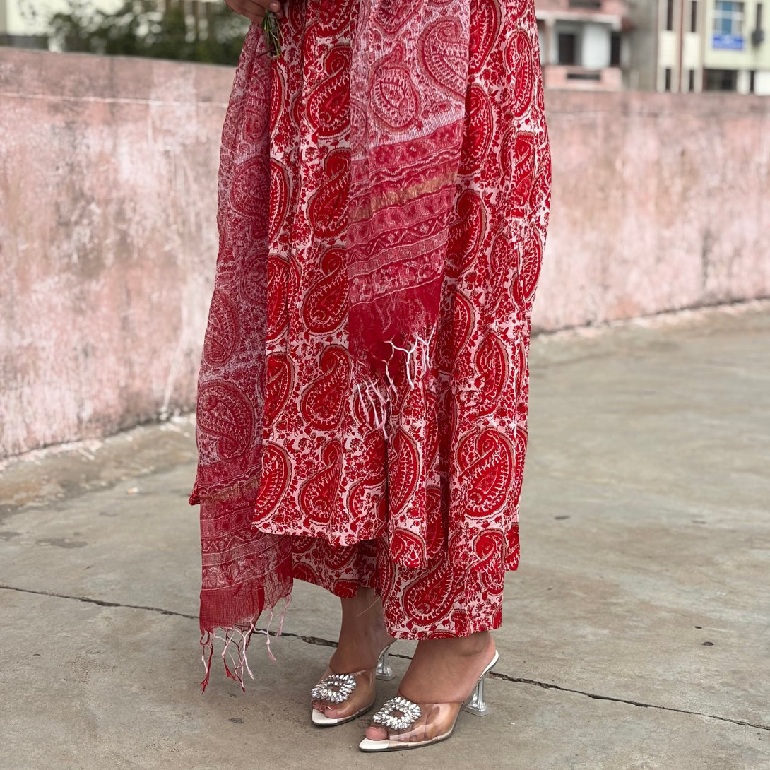 Make a stunning statement in this beautiful red and white paisley print Anarkali suit set. The full-length, flared Anarkali kurta is adorned with a captivating all-over paisley pattern, creating a rich and classic look. It features a comfortable V-neckline and long sleeves, with a flared silhouette that offers graceful movement and a flattering fit for all body types.