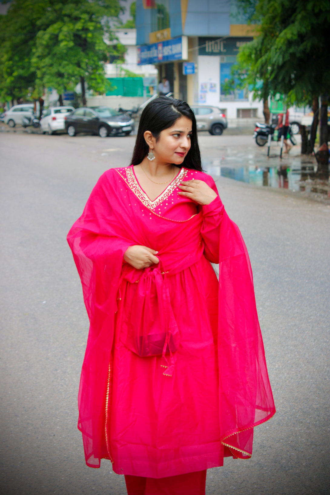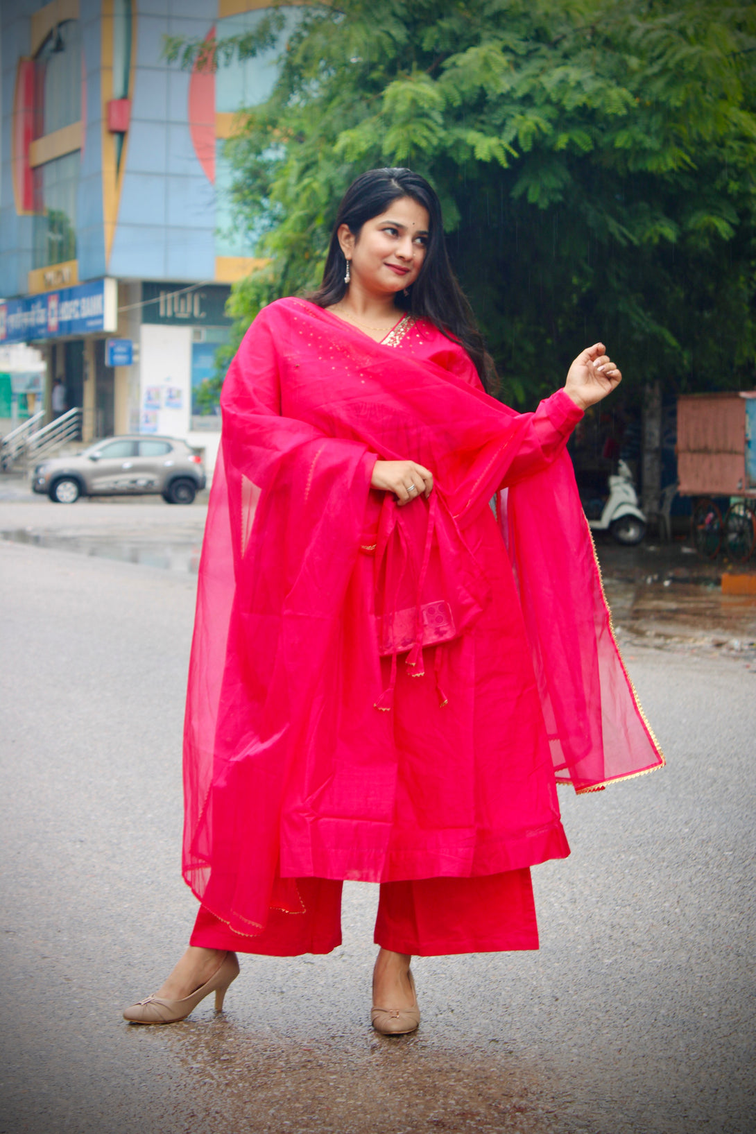 Red Pure Chanderi V Neck Solid Kurta Set for Women