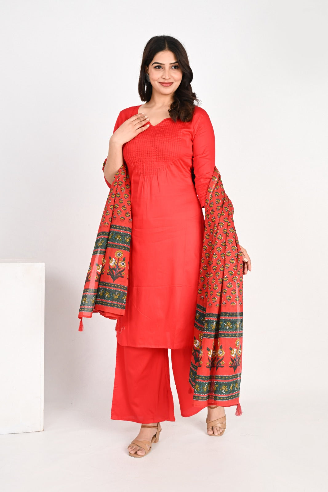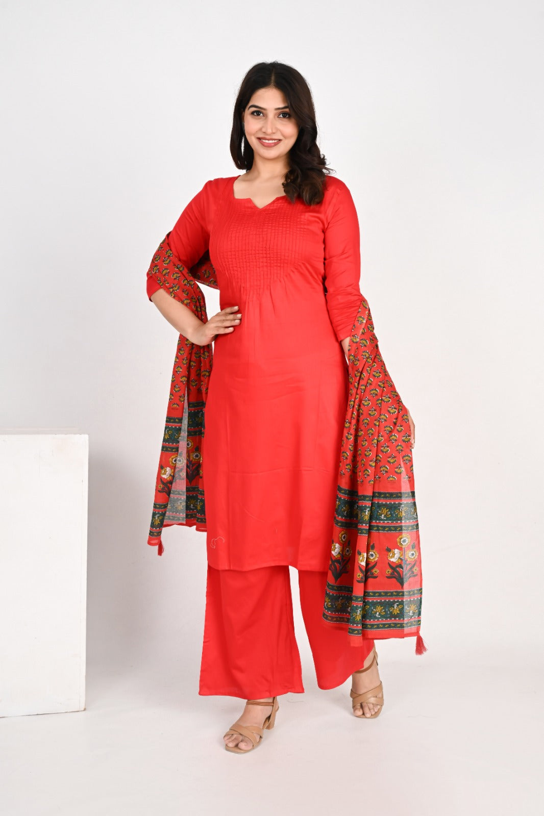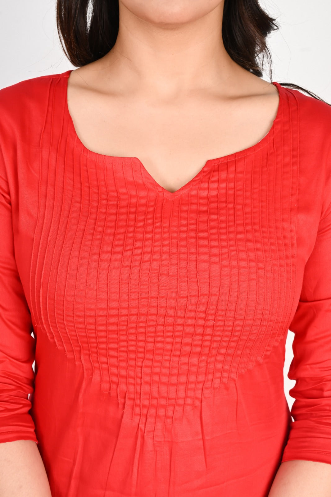 Make a statement in this striking crimson red suit set, a perfect blend of modern design and ethnic charm. The solid-colored kurti features a beautiful pleated yoke that adds texture and a flattering drape, leading to a smooth, straight-cut body. Designed with a classic V-neck and full-length sleeves, this kurti offers a clean and sophisticated silhouette.