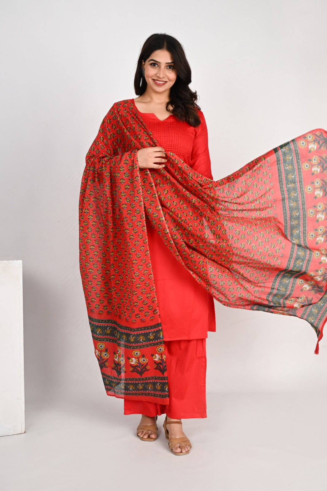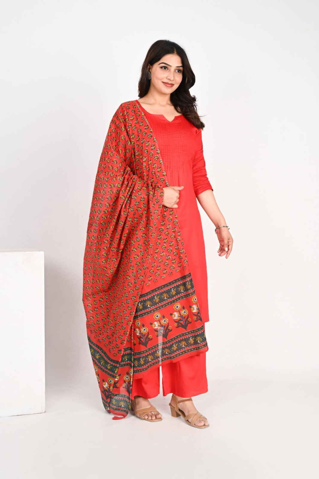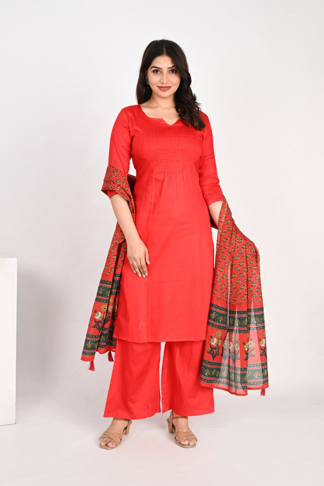 Make a statement in this striking crimson red suit set, a perfect blend of modern design and ethnic charm. The solid-colored kurti features a beautiful pleated yoke that adds texture and a flattering drape, leading to a smooth, straight-cut body. Designed with a classic V-neck and full-length sleeves, this kurti offers a clean and sophisticated silhouette.