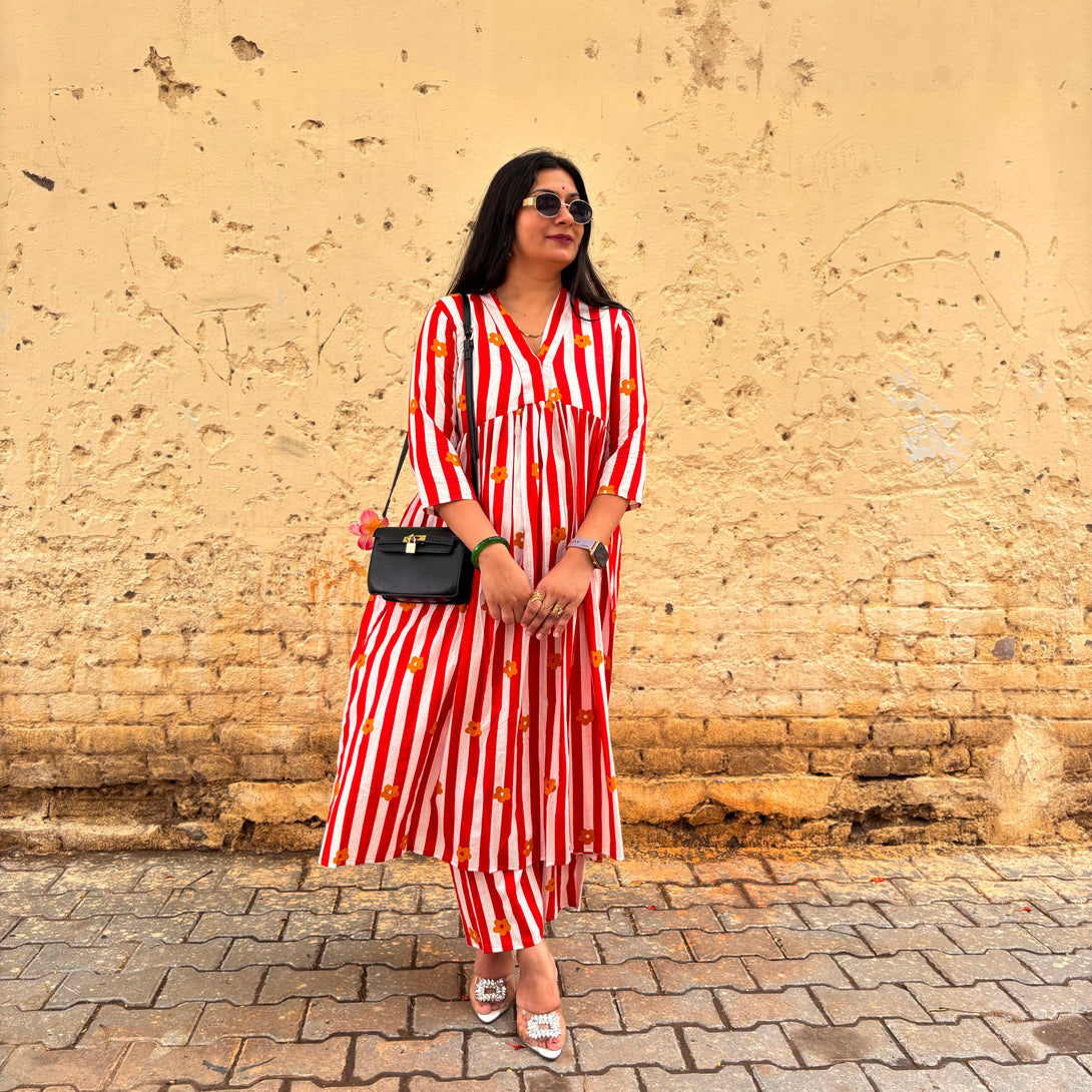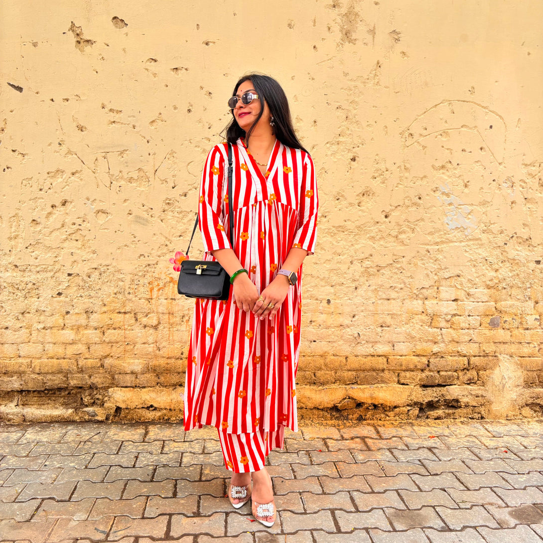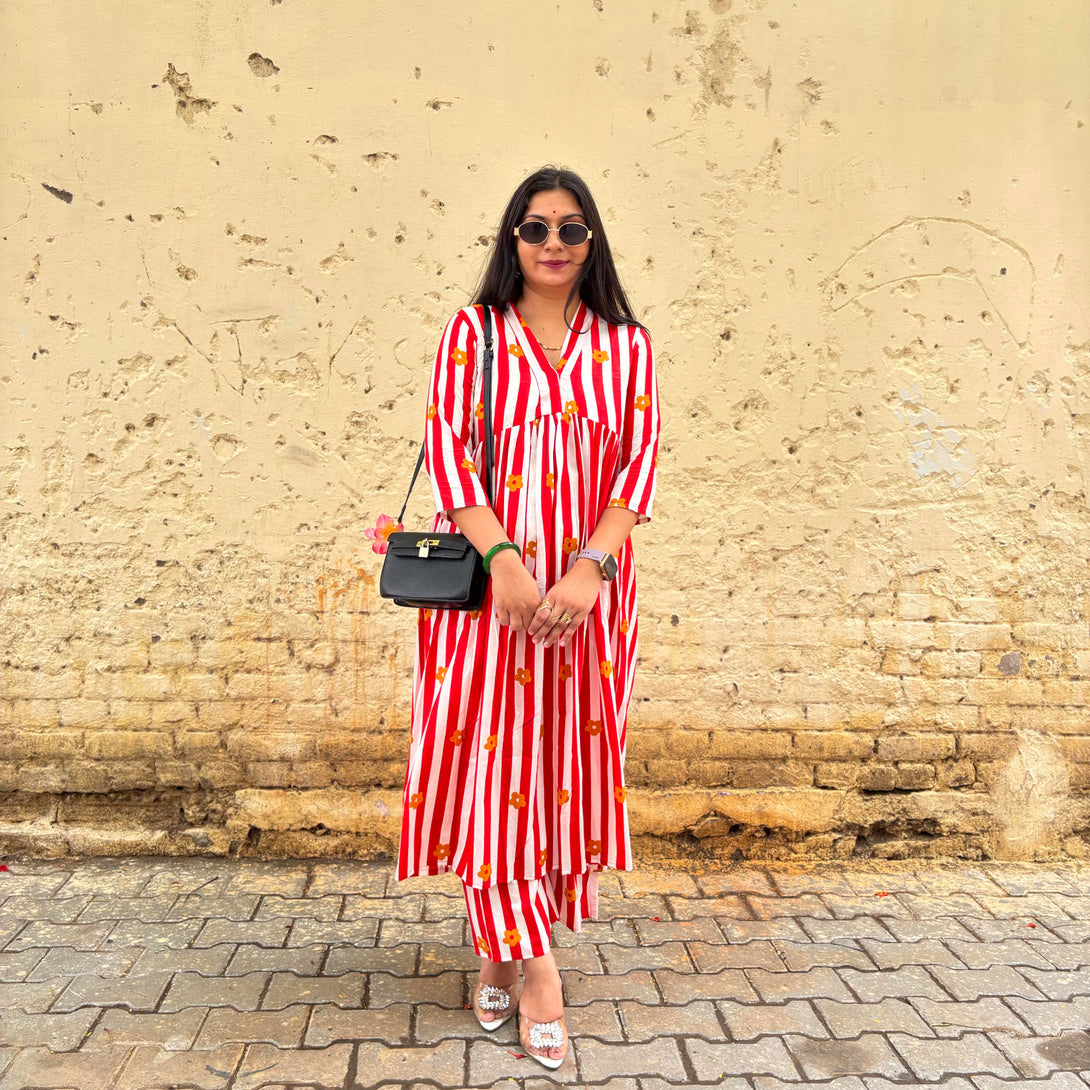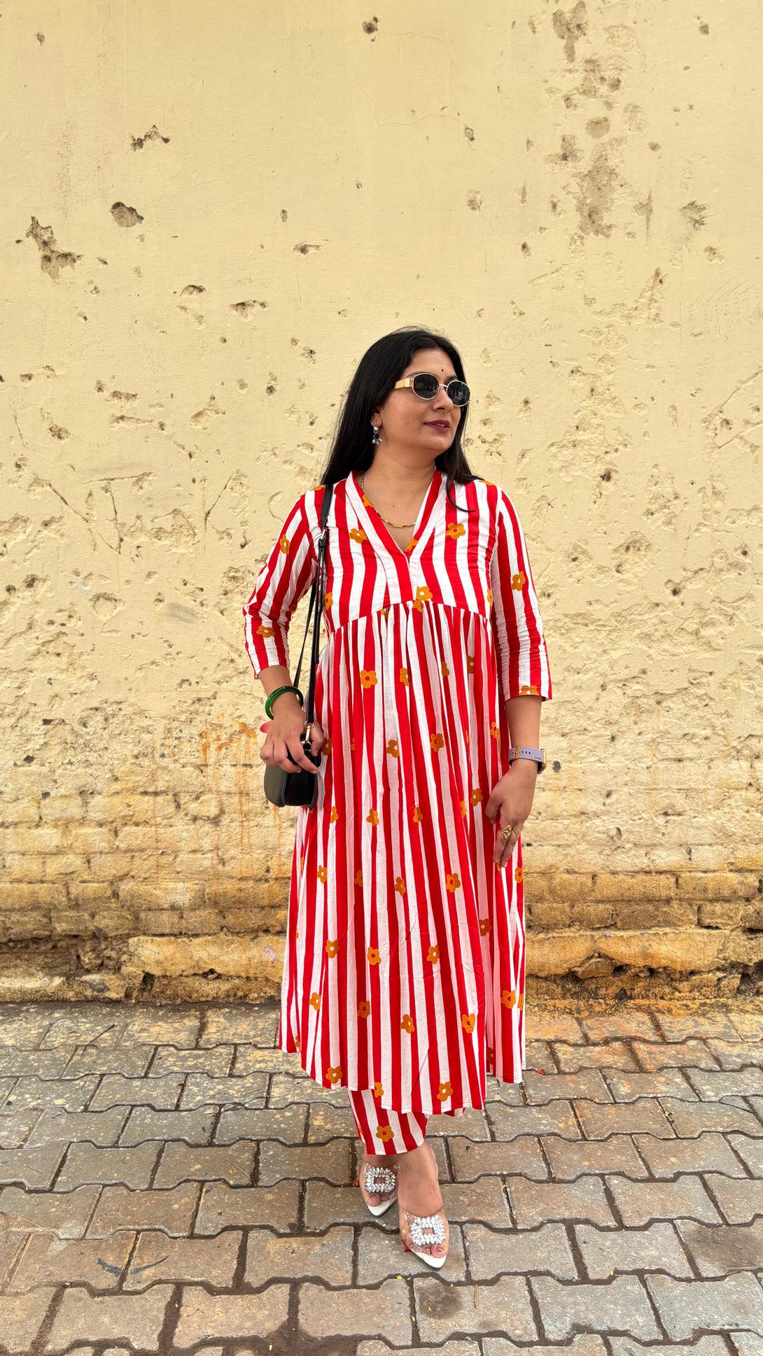 This elegant and comfortable red and white striped kurta set is a must-have for your wardrobe, blending classic patterns with delicate floral details. The knee-length A-line kurta features a timeless vertical stripe pattern that creates a flattering, elongated silhouette. A subtle yet beautiful touch is the presence of scattered small yellow and white floral motifs, adding a soft, feminine contrast to the bold stripes. The kurta is designed with a simple V-neckline and three-quarter sleeves, ensuring a comfortable and relaxed fit for all-day wear.