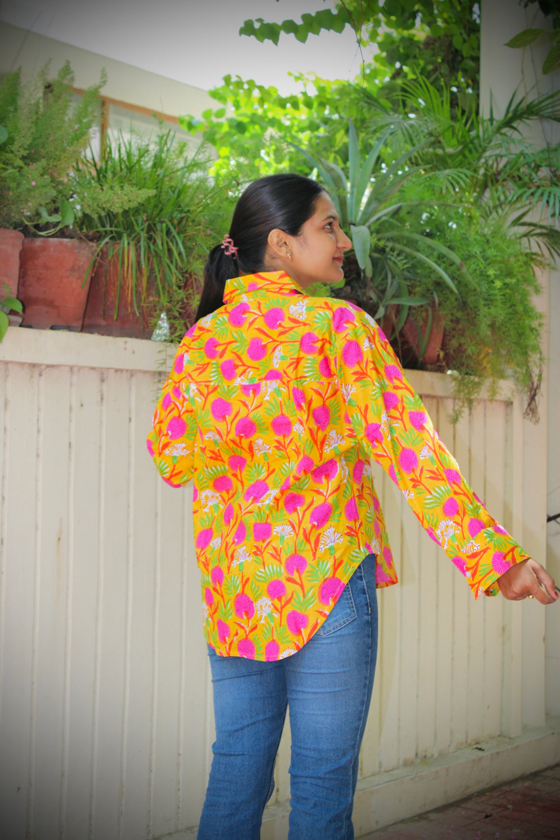 Yellow & Pink Floral Printed Cotton Shirt for Women