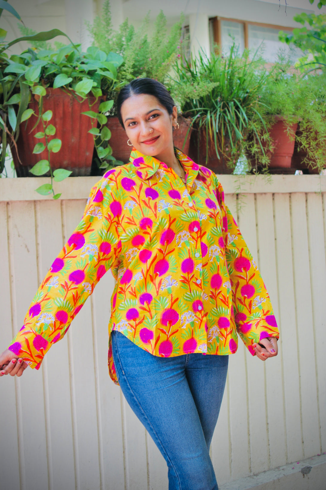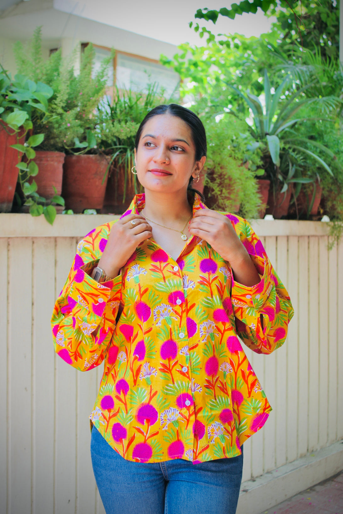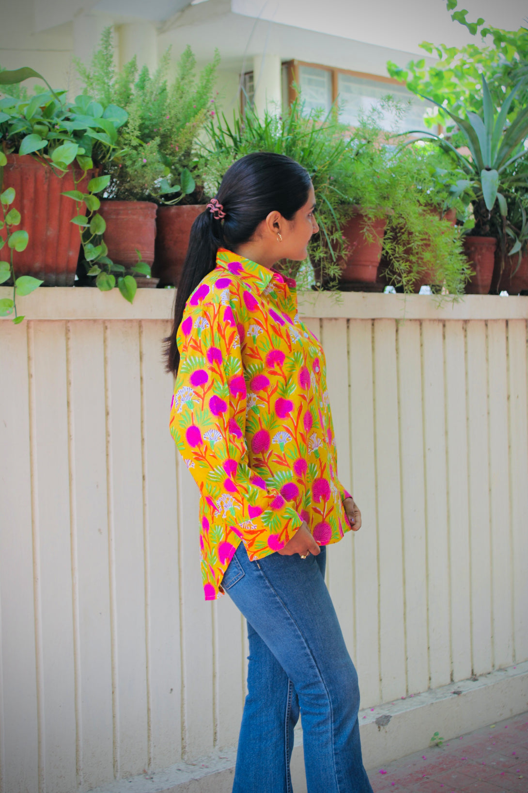 Top: Vibrant yellow shirt with bold pink and green floral/botanical prints, a collar, and a button-down front.