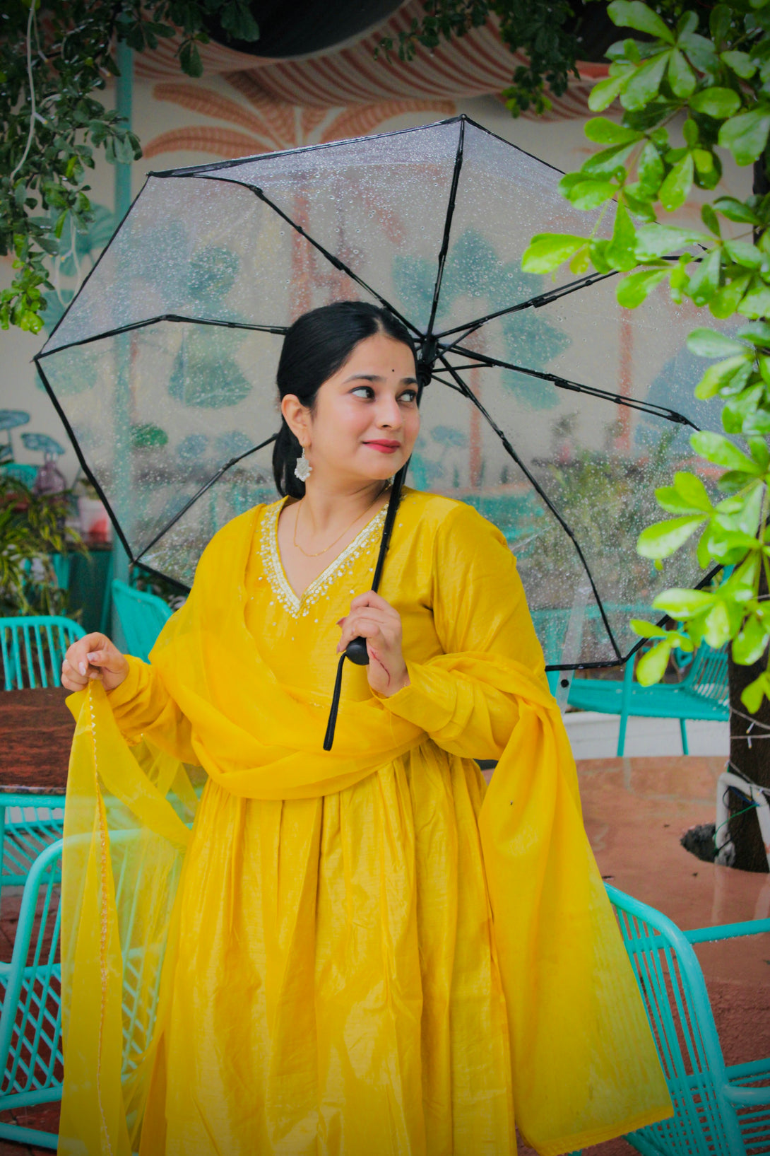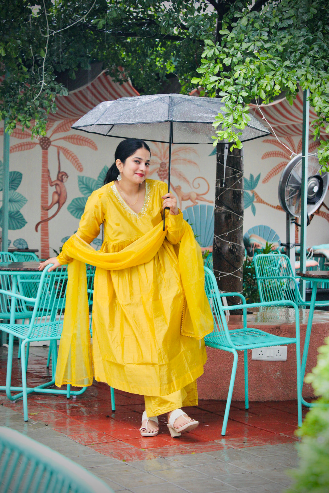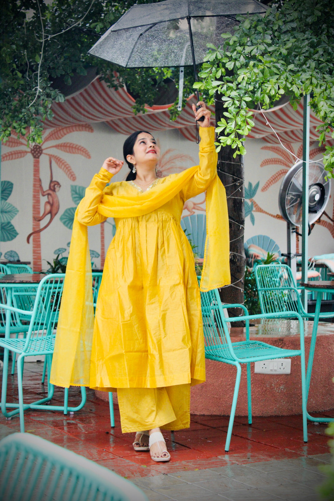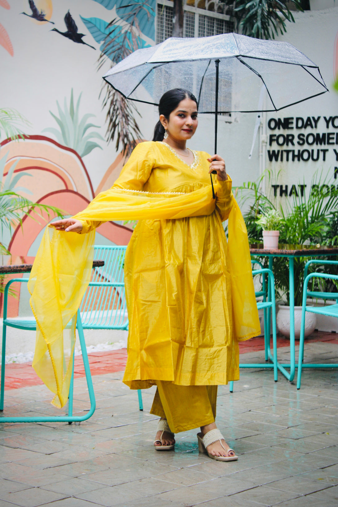 Yellow Pure Chanderi V Neck Solid Kurta Set for Women